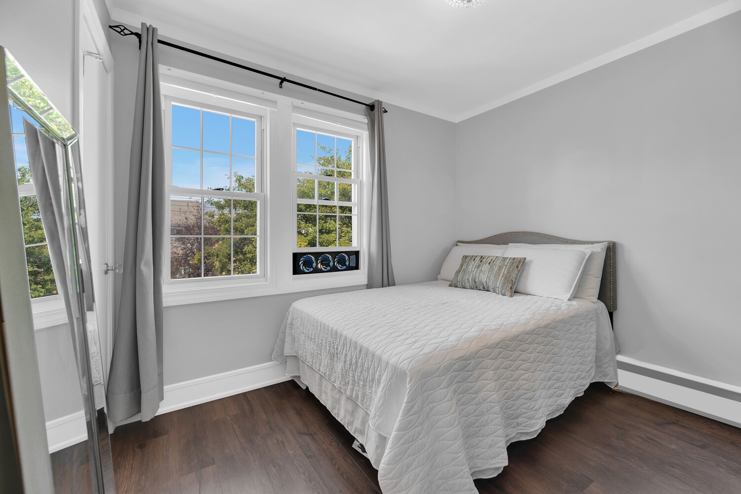 Step inside and you'll be greeted by rich dark hardwood floors and oversized windows that flood the home with an abundance of natural sunlight. The main level offers a versatile layout with a generous living and dining area, plus a windowed kitchen outfitted with sleek stainless steel appliances (including a microwave), quartz countertops, and ample custom cabinetry.