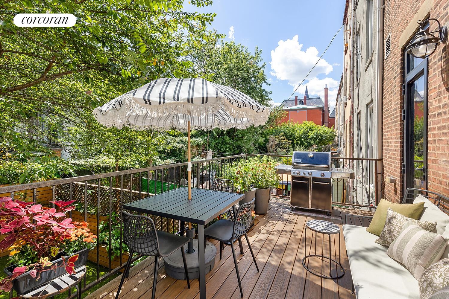 - Renovated owner's duplex with two private outdoor spaces: a sunlit deck with grill and irrigation, set over a picturesque backyard, patio & bluestone path.
