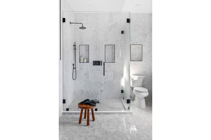 Occupying the top level, the primary suite is a private sanctuary of unparalleled scale. Two terraces extend the living space outdoors, while a massive walk-in closet provides dressing room luxury. The en-suite bathroom is a showpiece: a spa-like expanse with a floating soaking tub, oversized shower, and 96" rattan double vanity, all bathed in sunlight from the wall of windows. Bianco Carrara tiling throughout enhances the sense of serenity, while oil-rubbed bronze fixtures add subtle drama.
