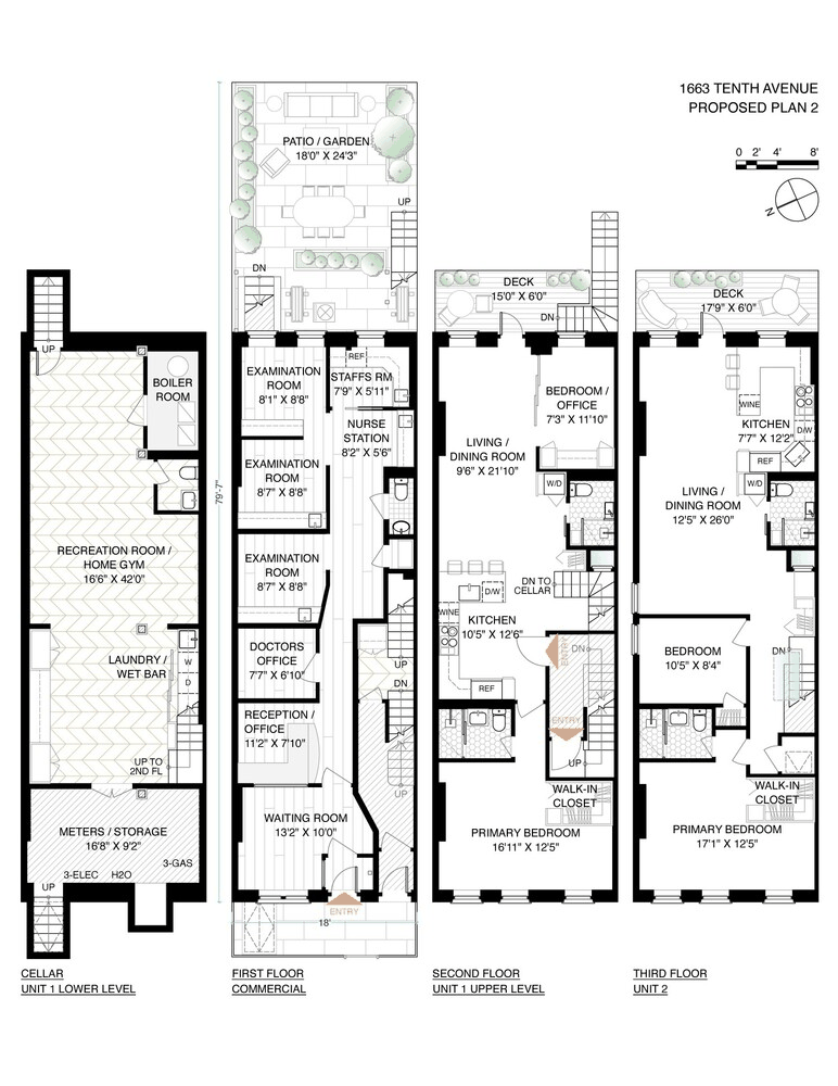 11-foot lobby ceilings usher you into the two residential units of the building. Each unit provides almost 1,000 sq. ft. of living space, 2- & 3-bedroom layouts, with open kitchens, separate dining areas, walk-in closets, and 1 bathroom. Hardwood floors run throughout, and handsome woodwork frames the windows and doorways. All units are updated with split A/C units. 9 1/2-foot ceilings on the second floor, and almost 9-foot ceilings on the third floor, along with oversized windows, offer picturesque views of 10th Avenue from the front of the building & expansive New York Harbor views in the back of the building. Keep the rental units as is, or update to maximize monthly income.