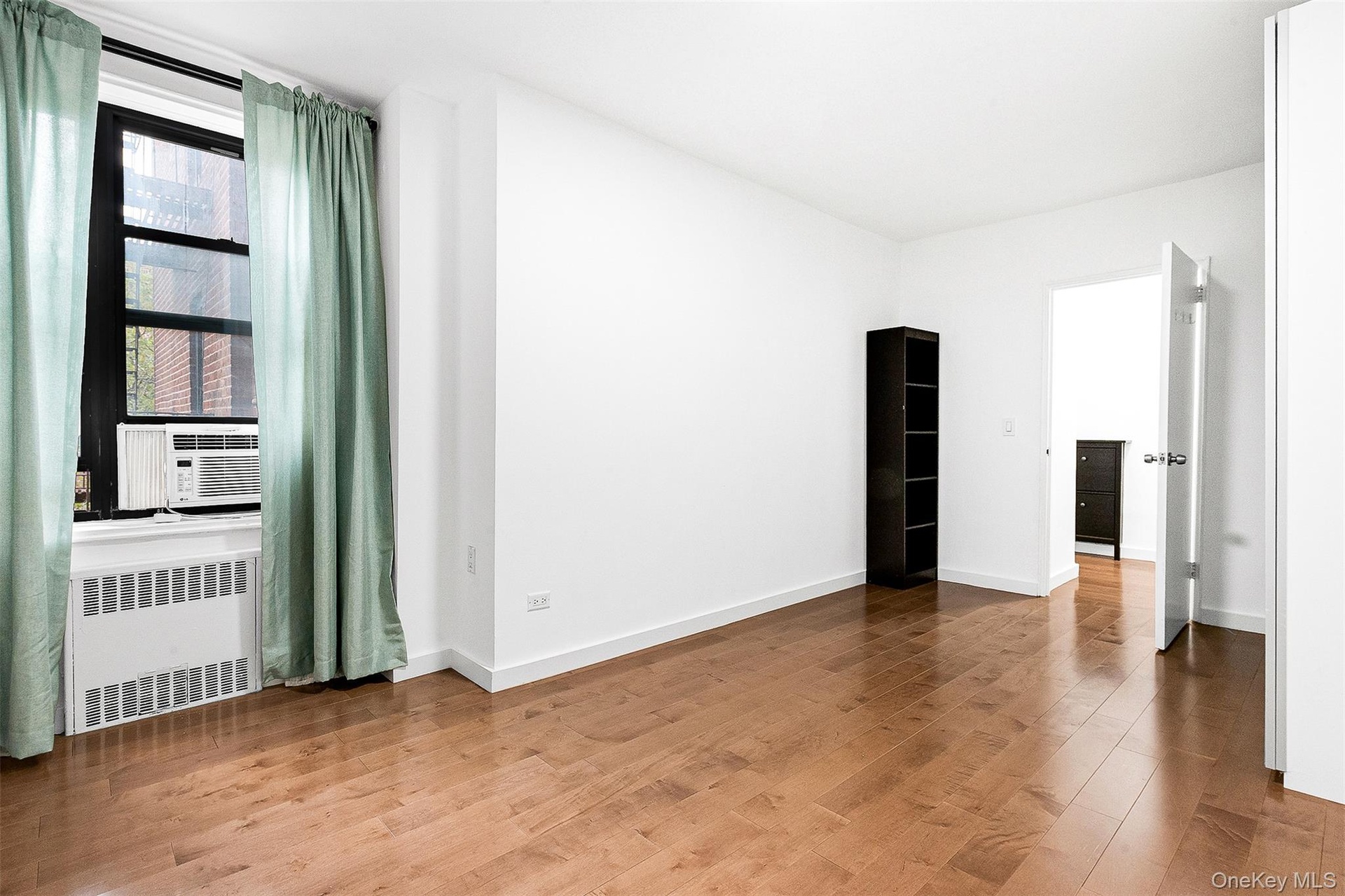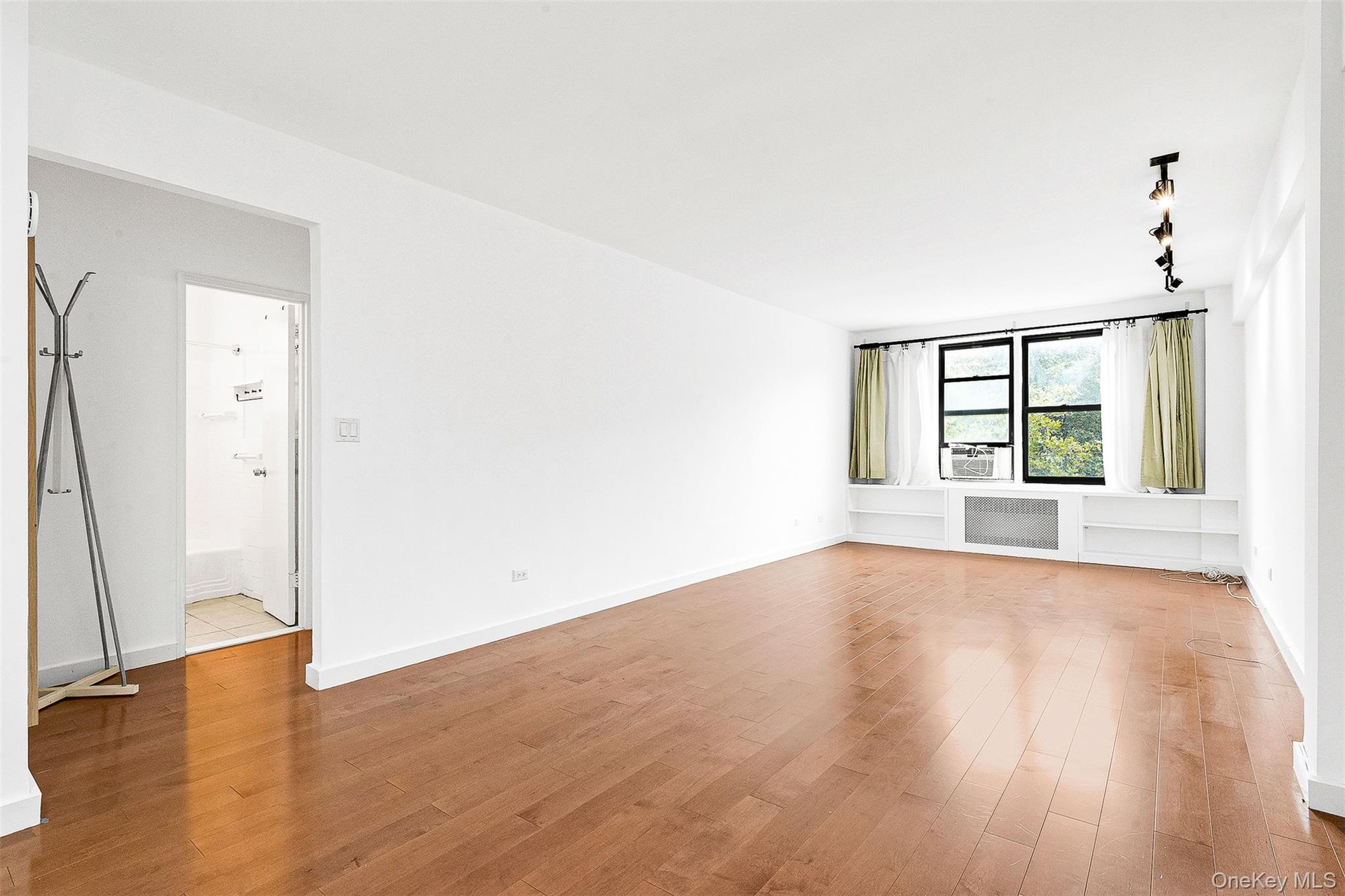 This corner 2 bedroom, 1 bath home is bathed in natural light all day. The thoughtful layout begins with a welcoming entryway and deep closets, leading to a dining/foyer area with a built-in bookcase. The updated windowed kitchen features white shaker cabinets, stainless steel appliances, and quartz countertops. An expansive living room with custom built-ins frames the large windows, ideal for entertaining. Both bedrooms do not share a wall and are generously sized with ample custom closets, while the full bath is nicely updated with a floating vanity and chrome finishes. Beautiful new wood floors run throughout, laid over red rosin paper for added soundproofing.