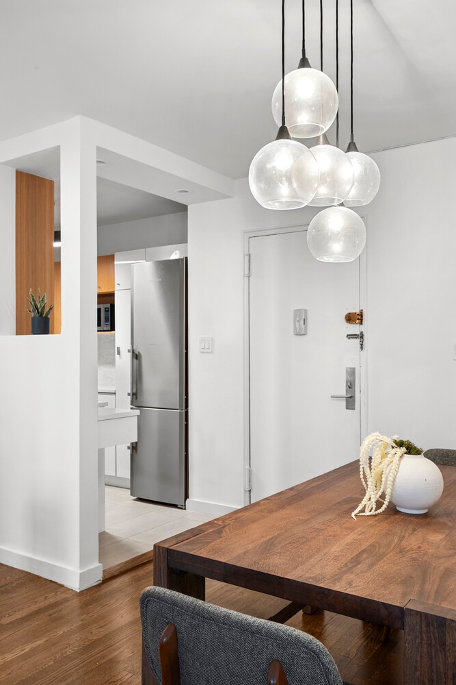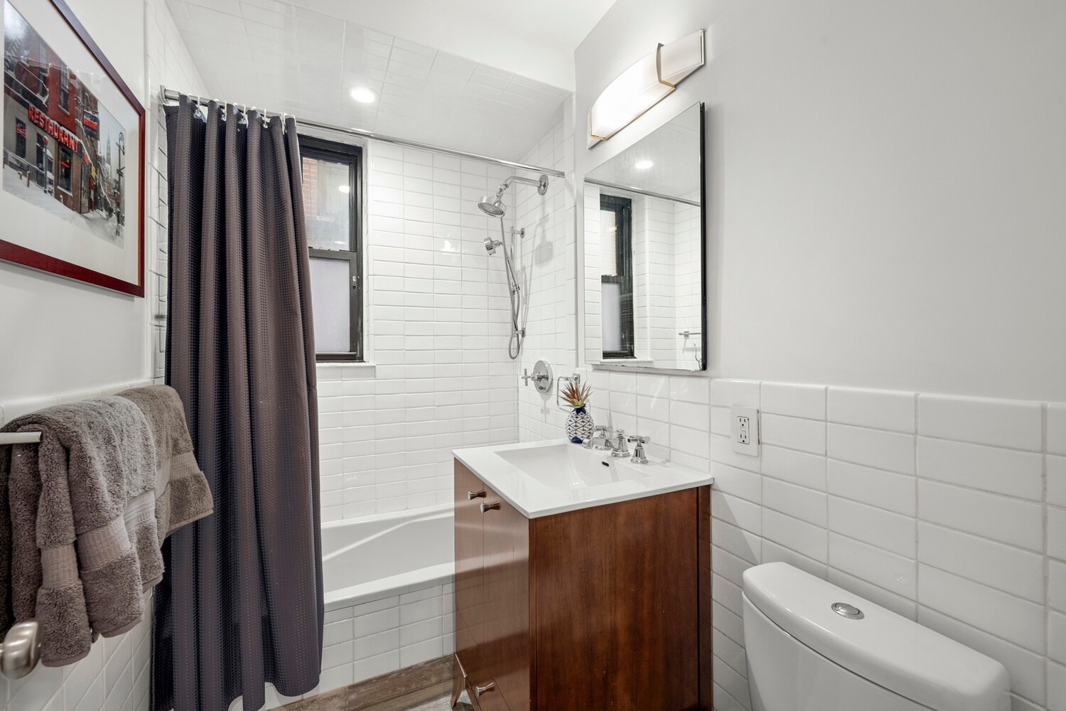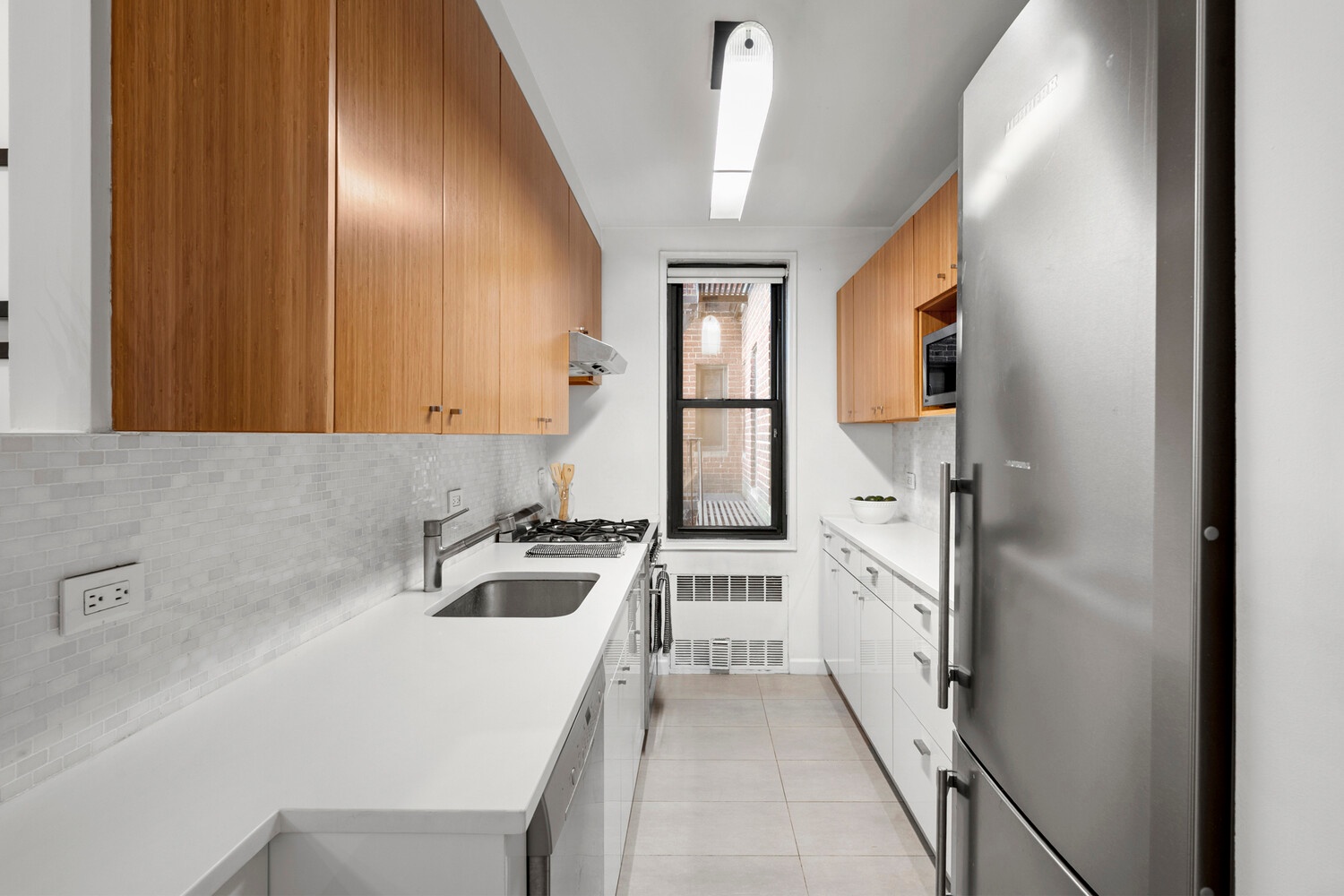 The newly renovated, windowed kitchen is a standout, featuring premium appliances by Liebherr, Smeg, and Bosch. Abundant custom cabinetry, Caesarstone countertops, and a striking backsplash make the space as functional as it is elegant. The windowed bathroom has also been tastefully renovated, complementing the home's clean, updated aesthetic.