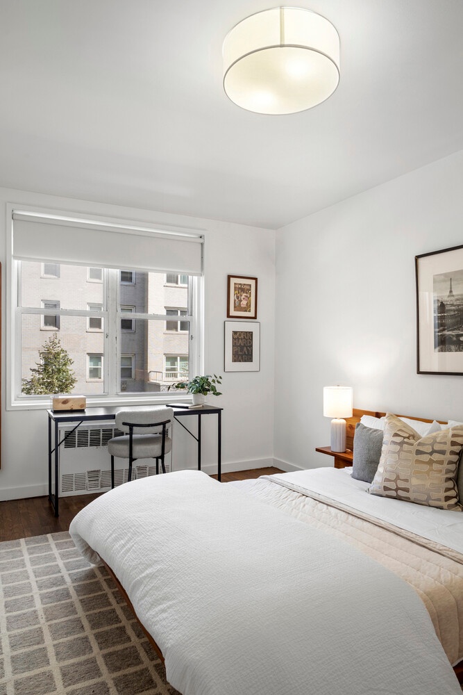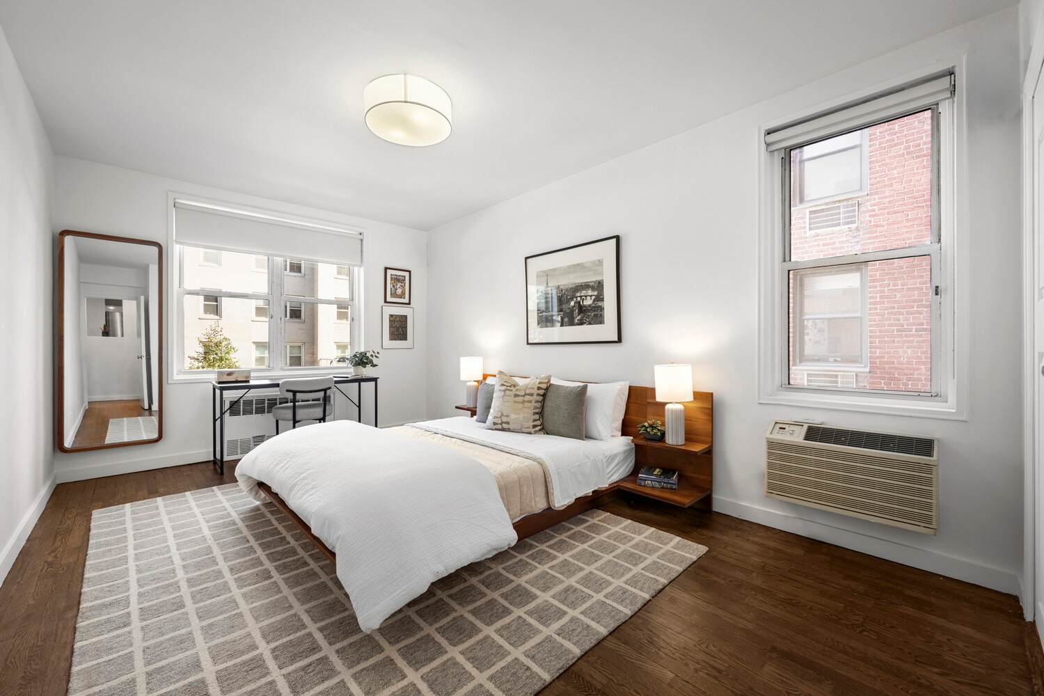 A generously scaled living room easily accommodates both living and dining areas, creating the perfect setting for entertaining or relaxing at home. Hardwood floors run throughout, and multiple closets provide excellent storage. With bright north and east exposures, the apartment enjoys natural light and peaceful treetop views.
