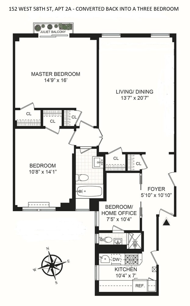 Welcome home to this true two bedroom two bath apartment in a premier location, one block to Central park, Carnegie Hall and Billionaire's row. This apartment offers pre-war elegance with high ceilings, coveted exposed beams and a spacious layout. 2A has been renovated with upscale marble flooring throughout the apartment. The inviting open floor plan leaves plenty of space for a full dining room table and a large living room for relaxing and entertaining. There is a windowed kitchen with stone countertops and ample cabinet space. The primary bedroom has two custom closets as well as additional built in storage and a charming Juliet balcony. The second bedroom is also spacious and quiet with custom closets and storage. Both the primary bath and smaller second bath with stand up shower are renovated. Washer/Dryer can be installed with board approval.