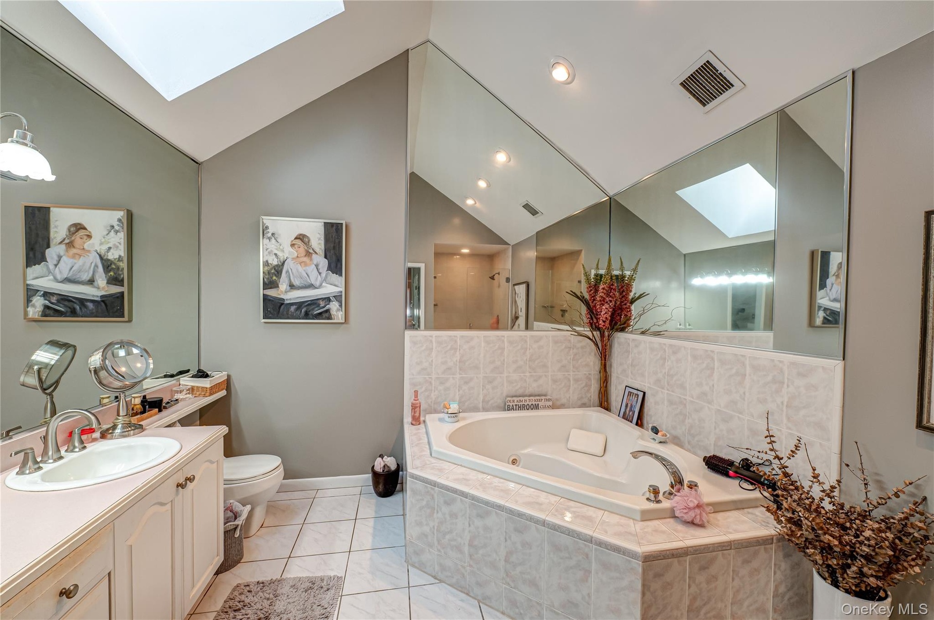 - Full bathroom featuring a skylight, a whirlpool tub, vanity, a shower stall, and light tile patterned floors
