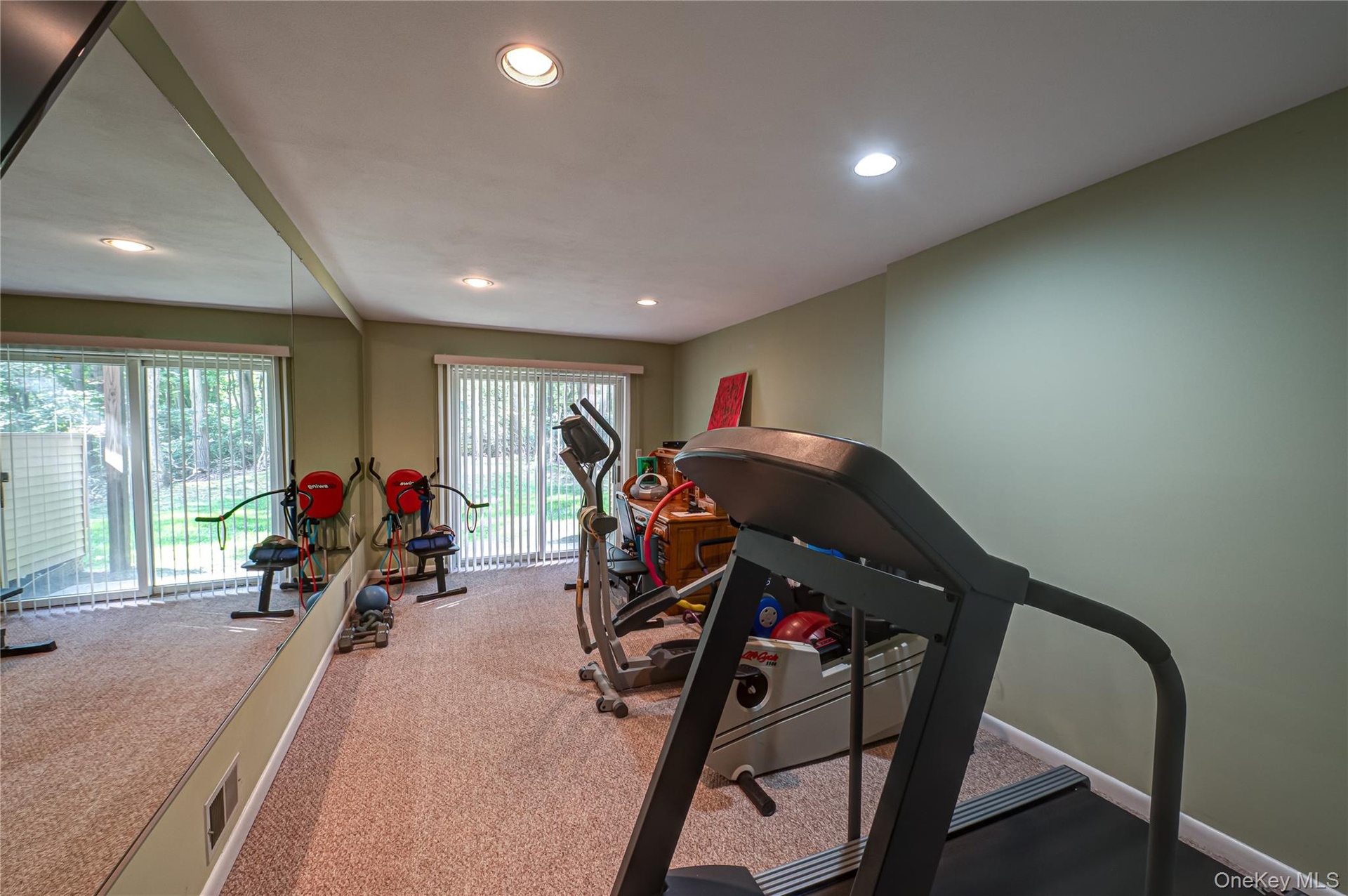 - Exercise area featuring recessed lighting and light carpet