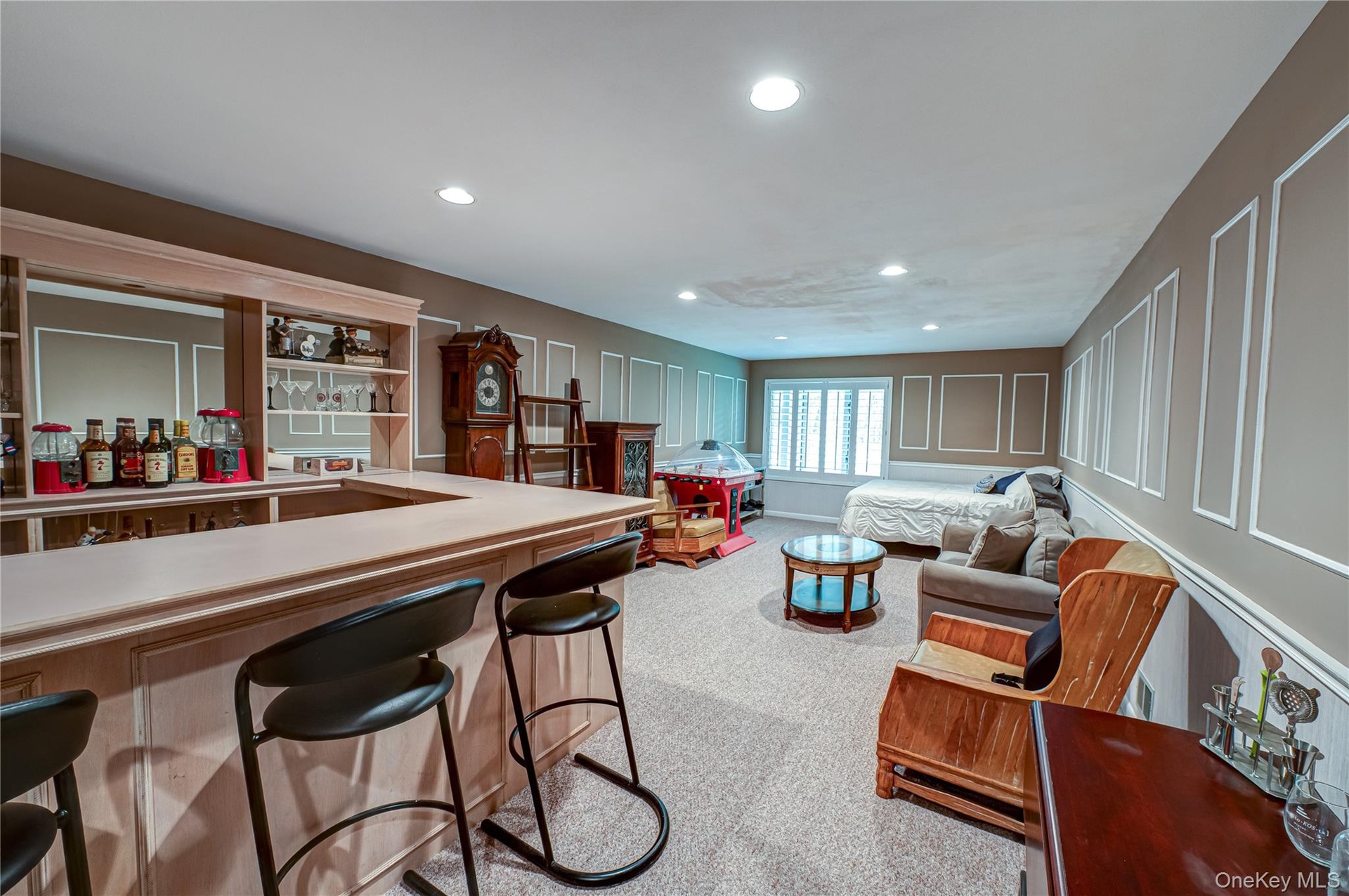 - Living area with a decorative wall, recessed lighting, light colored carpet, and a wainscoted wall