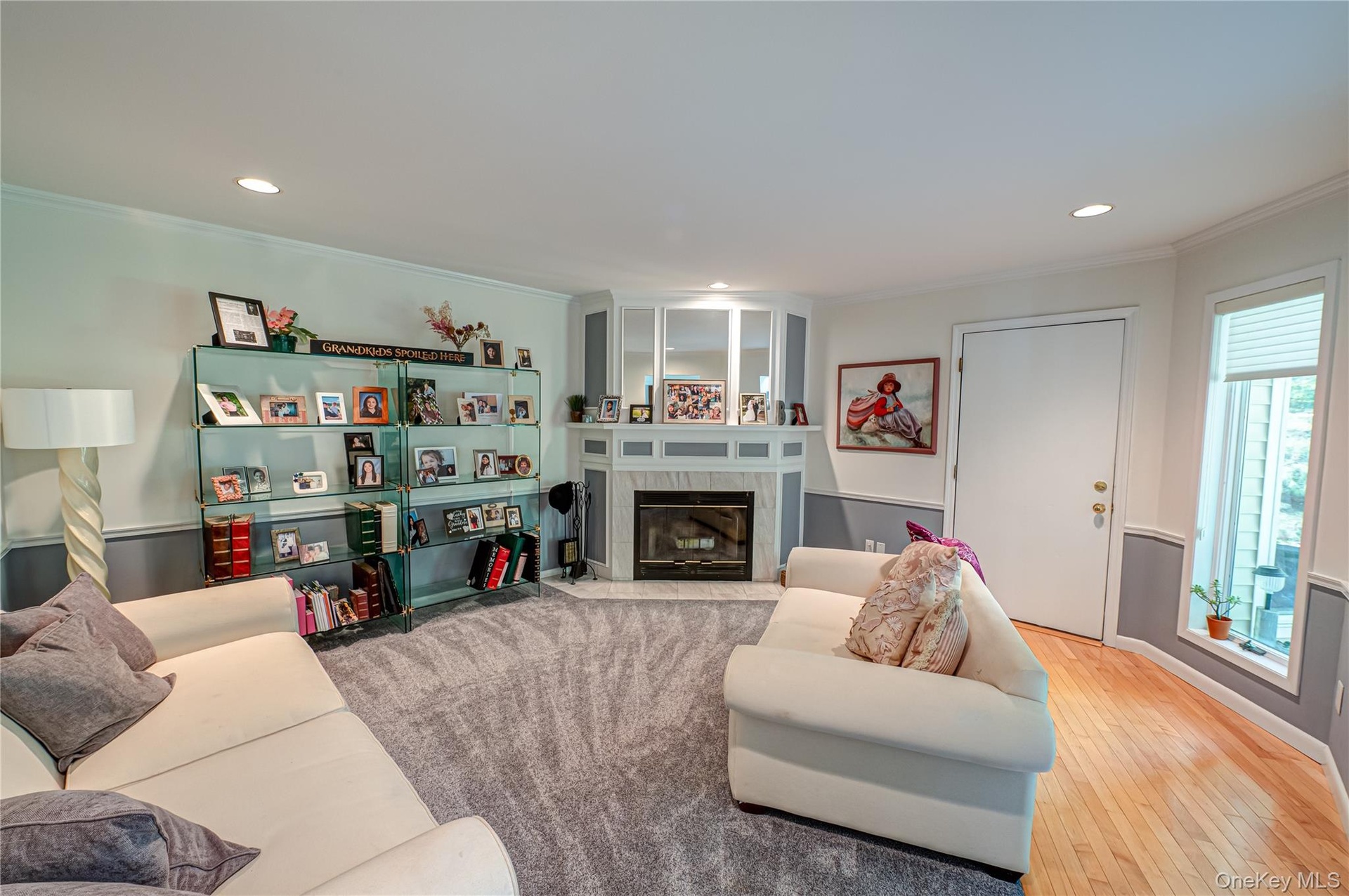 - Living area featuring recessed lighting, a fireplace, wood-type flooring, and ornamental molding