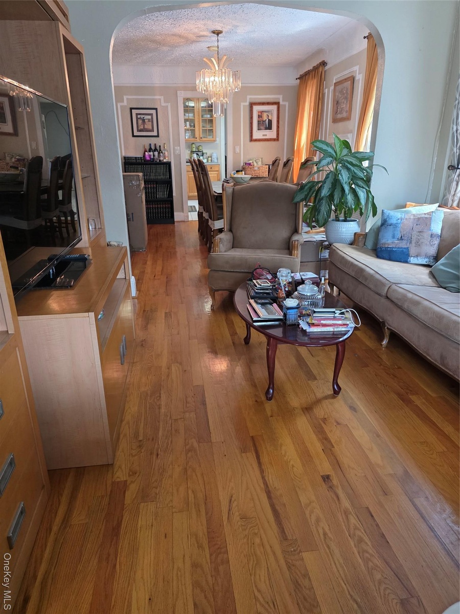 - Living area featuring arched walkways, light wood-style flooring, a chandelier, and a textured ceiling