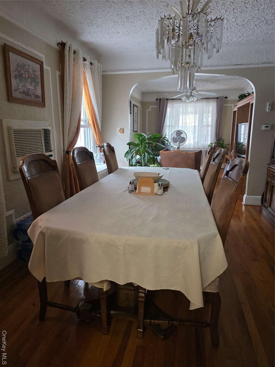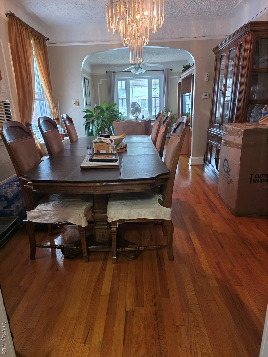 - Dining space with wood-type flooring, arched walkways, a textured ceiling, and a chandelier
