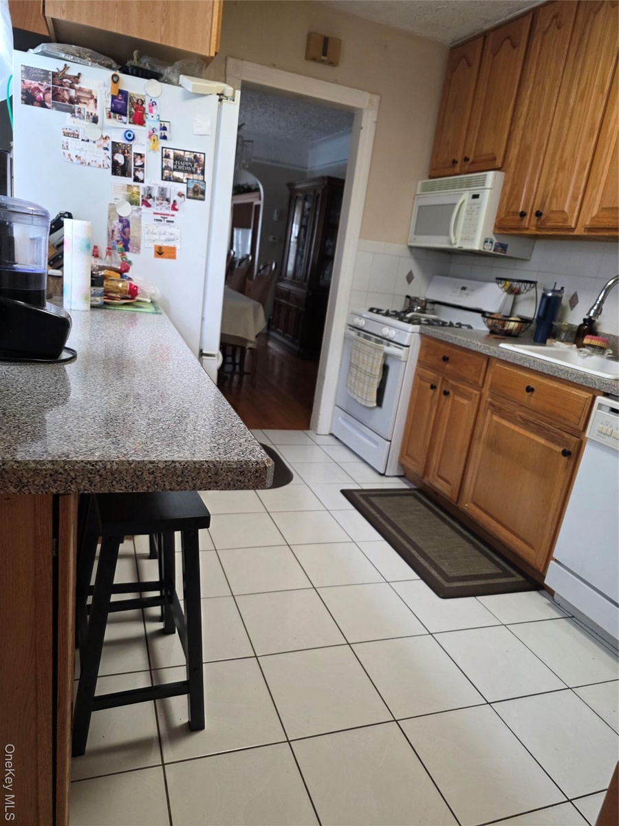 - Kitchen featuring brown cabinets, range, white refrigerator, a breakfast bar area, and a textured ceiling