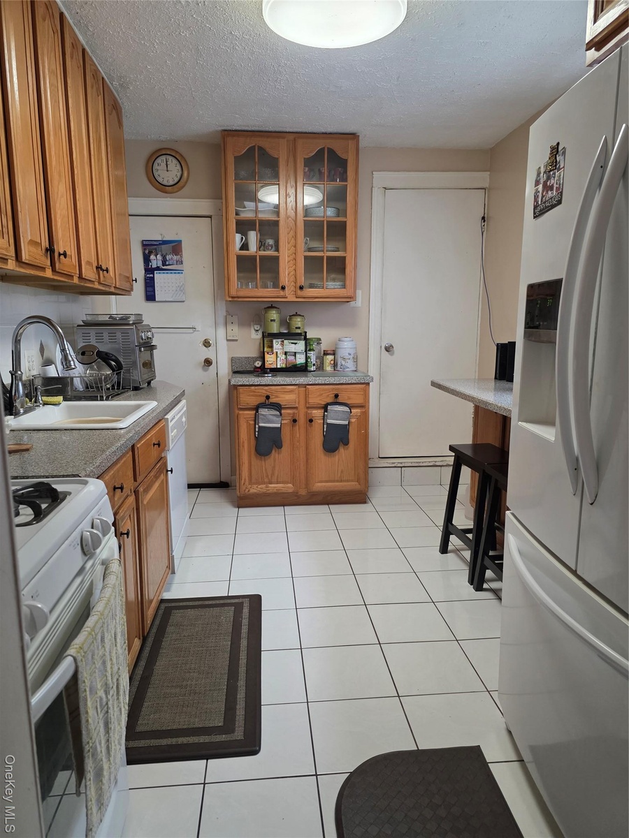 - Kitchen featuring brown cabinets, light tile patterned flooring, range, and white fridge with ice dispenser