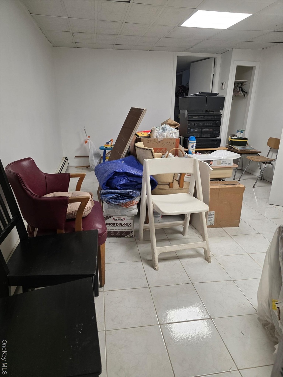 - Laundry area featuring brick wall, washing machine and clothes dryer, light tile patterned floors, and cabinet space