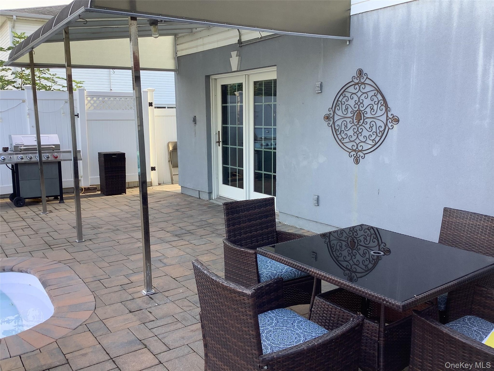 - View of patio featuring a grill and outdoor dining area