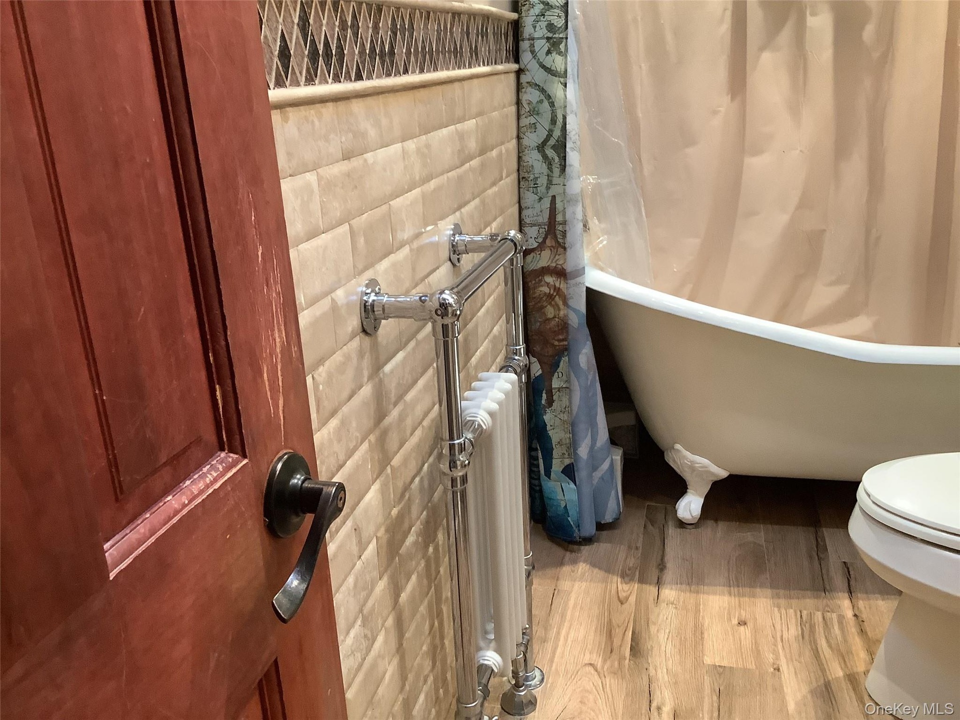 - Bathroom featuring wood finished floors, radiator heating unit, and a combined bath / shower with freestanding tub