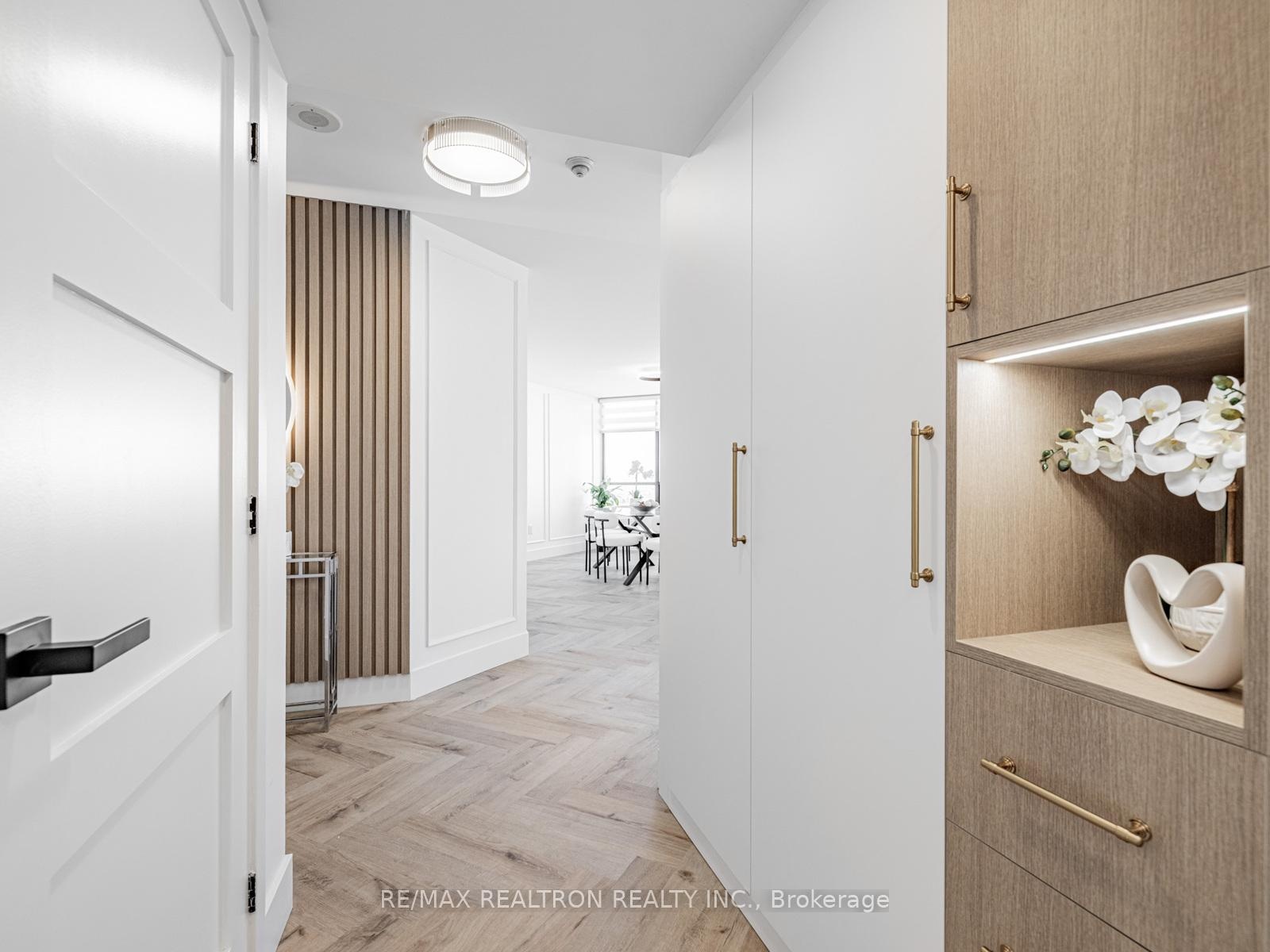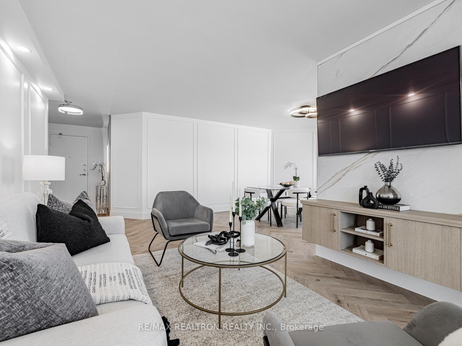 Absolutely stunning and meticulously renovated condo located in the prestigious Promenade Towers, offering approximately 1,250 square feet of luxury living in the heart of Thornhill. This bright and spacious 2-bedroom, 2-bathroom suite showcases top-tier finishes throughout, including elegant herringbone flooring, smooth flat ceilings, pot lighting, and premium window treatments. The designer kitchen is a true showpiece, featuring quartz countertops, modern cabinetry, and an efficient layout thats perfect for both everyday living and entertaining. Both bathrooms have been beautifully updated with spa-inspired elements: premium tiling and faucets, glass enclosed showers, automatic lighting and a private makeup vanity. Thoughtful custom closet systems maximize storage and organization, adding to the homes functionality and style. The expansive living and dining areas are perfect for relaxing or hosting, and include a bonus brand new TV , ready for your enjoyment. Two walkouts lead to an oversized private balcony with sweeping views of the Thornhill skyline, ideal for morning coffee or evening sunsets. This well run building offers low and all-inclusive maintenance fees with a full range of high-quality amenities, including 24-hour security, a swimming pool and indoor whirlpool, a fully equipped fitness centre, a renovated party room, and tennis/pickleball courts. Building is currently modernizing all hallways! Enjoy the convenience of an unbeatable location just steps from Promenade Mall, public transportation, schools, parks, and places of worship. This is a rare opportunity to own a turnkey home in one of Thornhill's most desirable and vibrant communities, where luxury, comfort, and convenience converge.