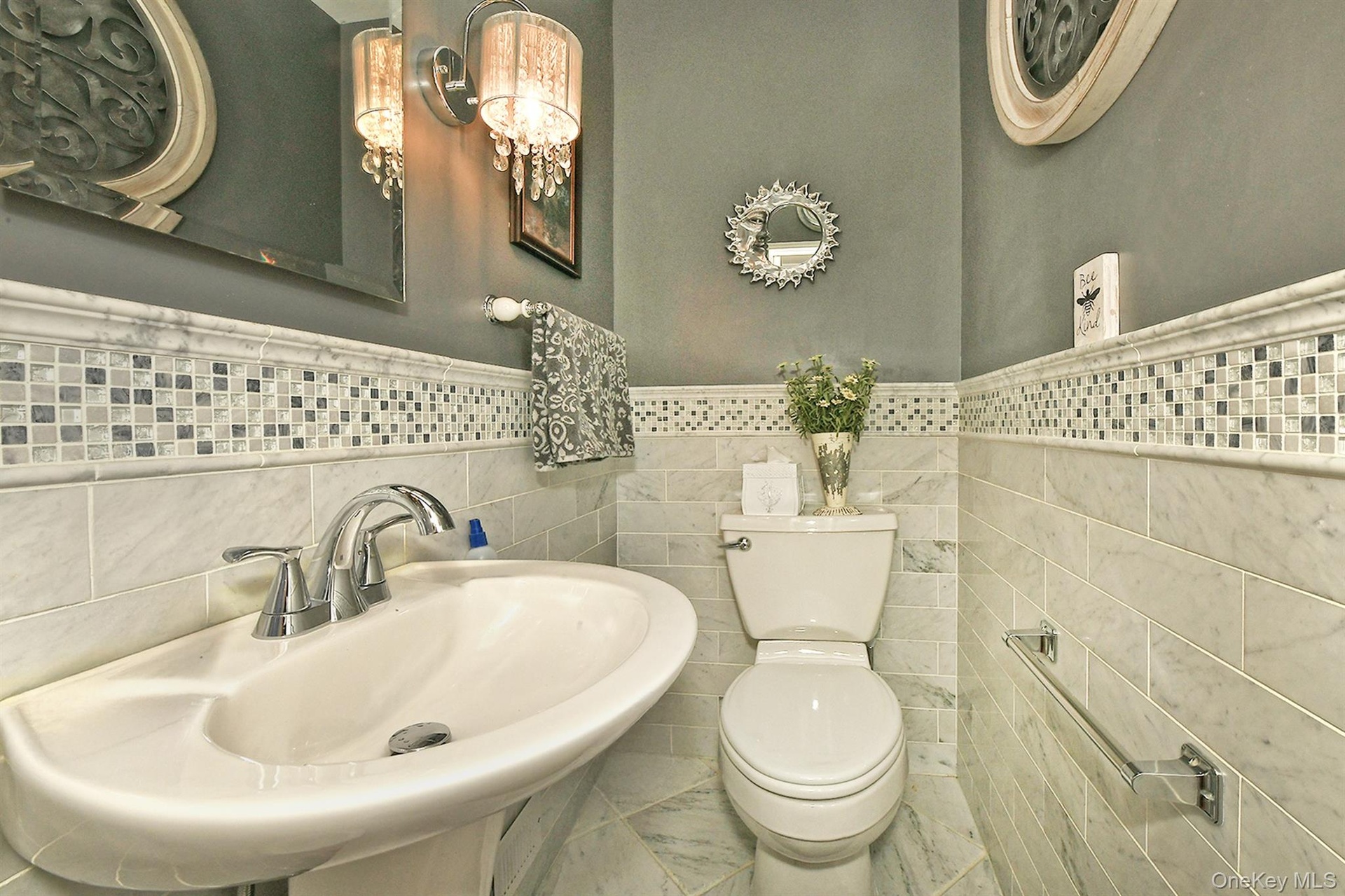 - Half bathroom with a wainscoted wall and tile walls