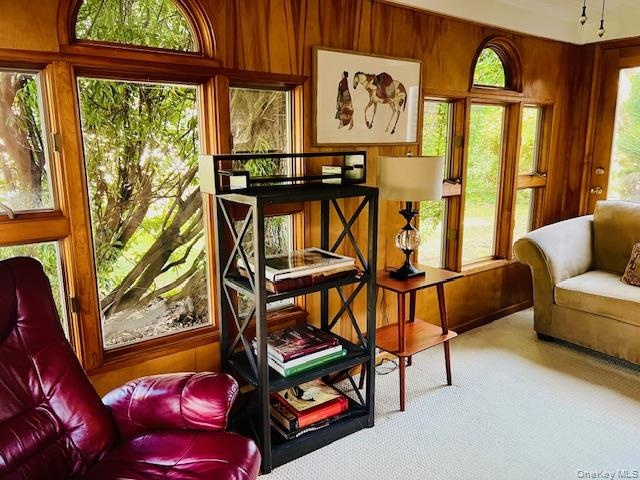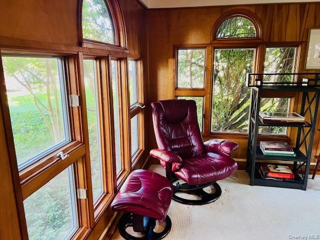 - Living area with arched walkways, recessed lighting, crown molding, and Wood burning fireplace