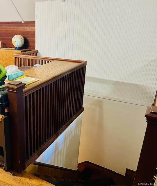 - Corridor featuring arched walkways, hardwood / wood-style flooring, crown molding, stairway,