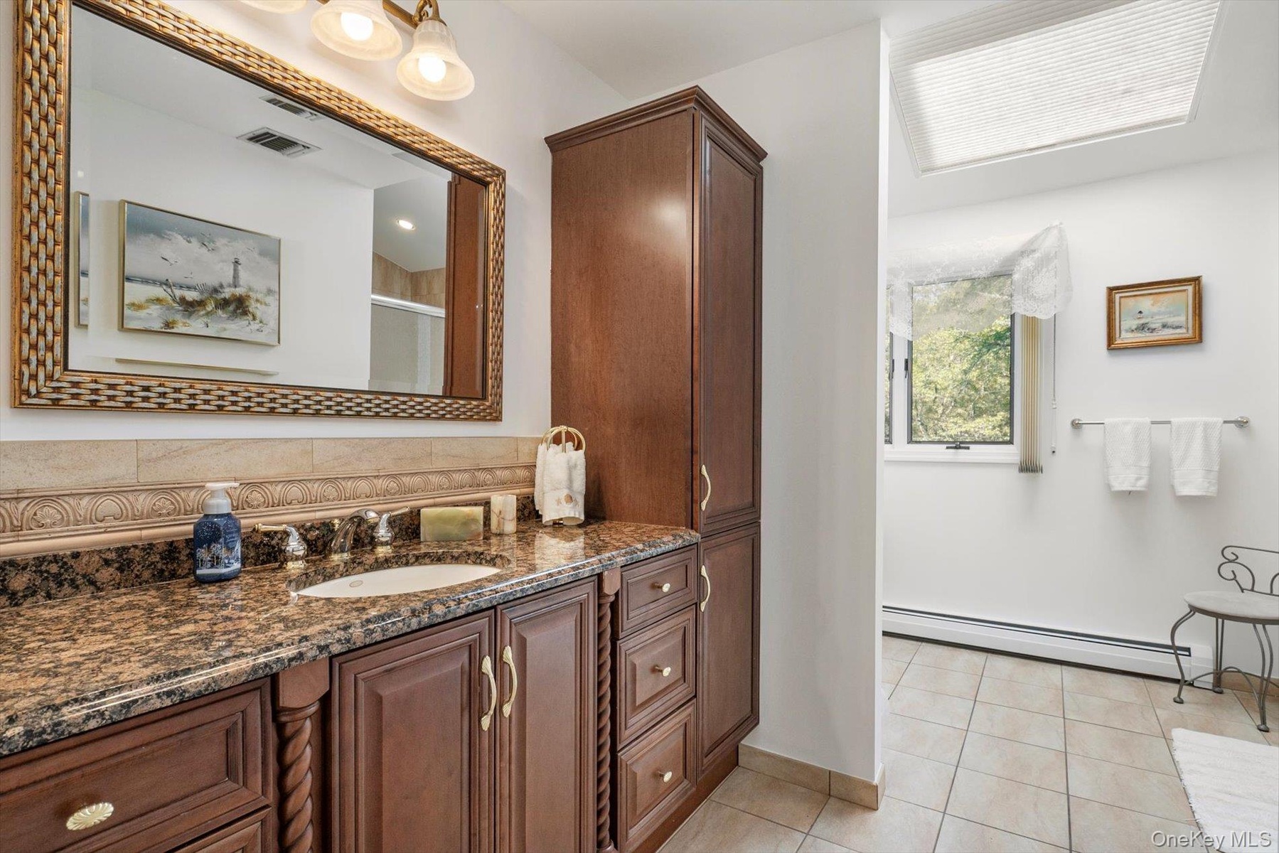 - Full bathroom featuring light tile patterned floors, vanity, baseboard heating, and a stall shower