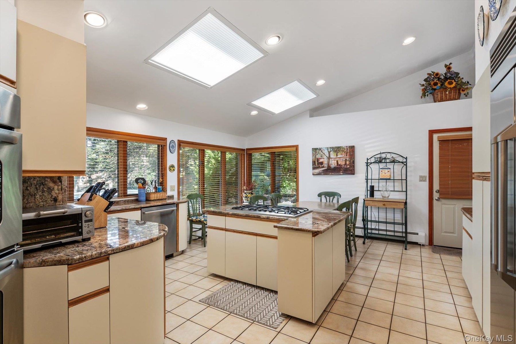 - Kitchen featuring vaulted ceiling, recessed lighting, light tile patterned floors, dark stone countertops, and stainless steel appliances