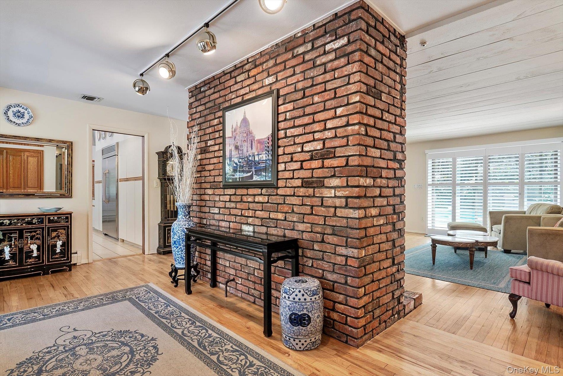 - Living area featuring hardwood / wood-style flooring, a brick fireplace, and rail lighting