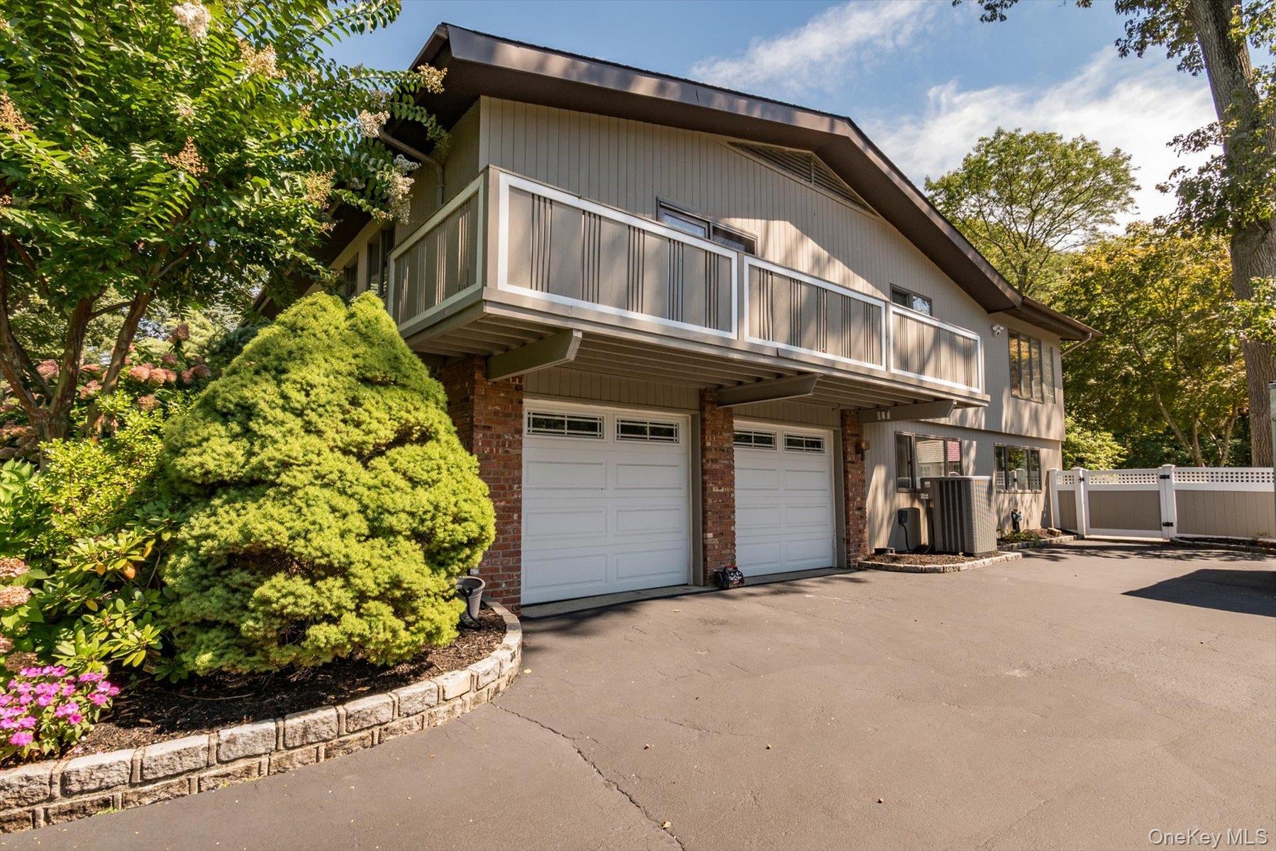 - View of home's exterior with brick siding, a garage, driveway, a balcony, and a gate