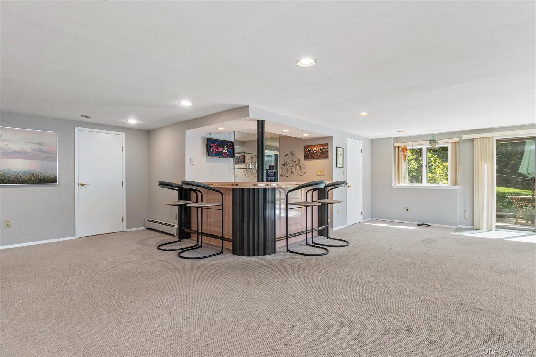 - Living area with a baseboard radiator, carpet flooring, and recessed lighting