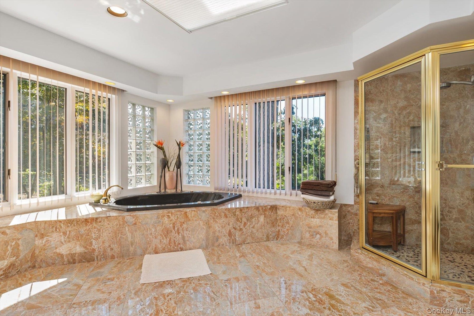 - Full bath featuring a stall shower, a bath, and recessed lighting