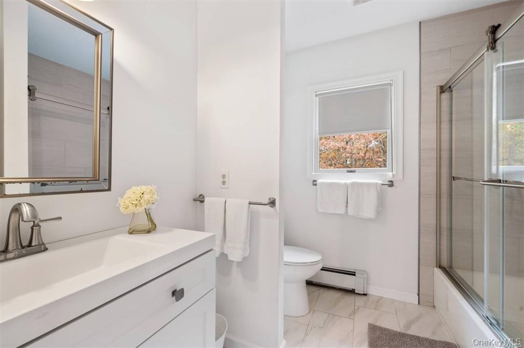 - Full bath featuring shower / bath combination with glass door, vanity, a baseboard radiator, and light marble finish floors