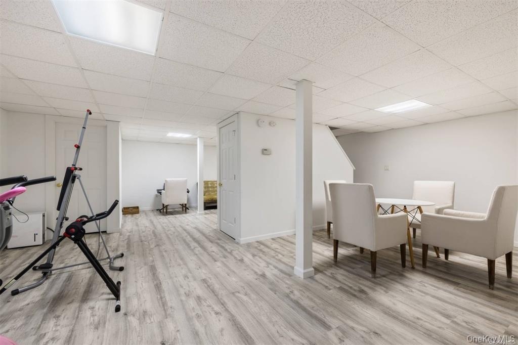 - Exercise area featuring light wood finished floors and a drop ceiling