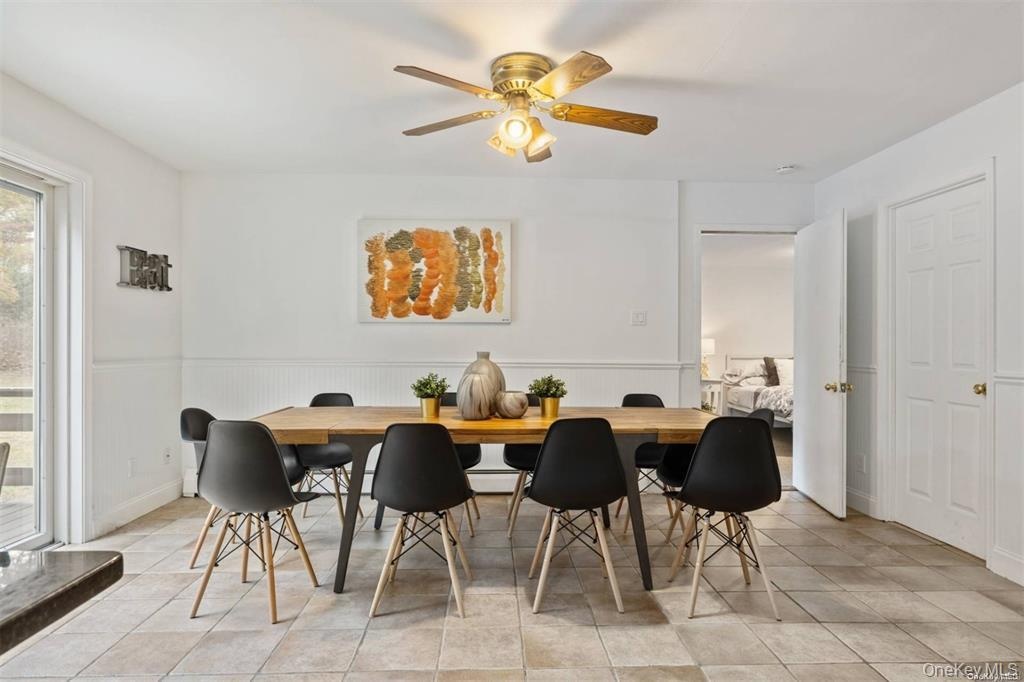 - Dining area featuring wainscoting, a ceiling fan, a baseboard radiator, and light tile patterned floors