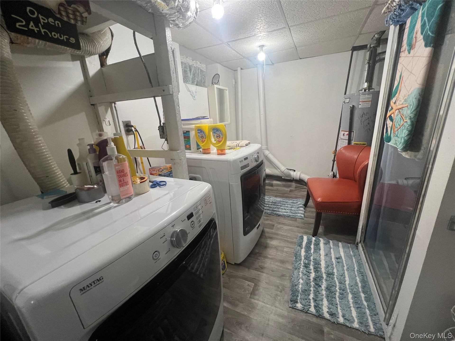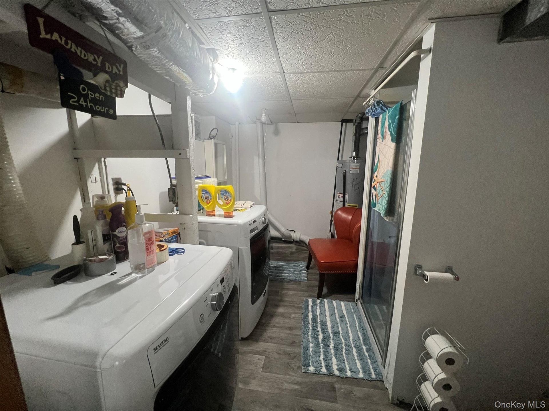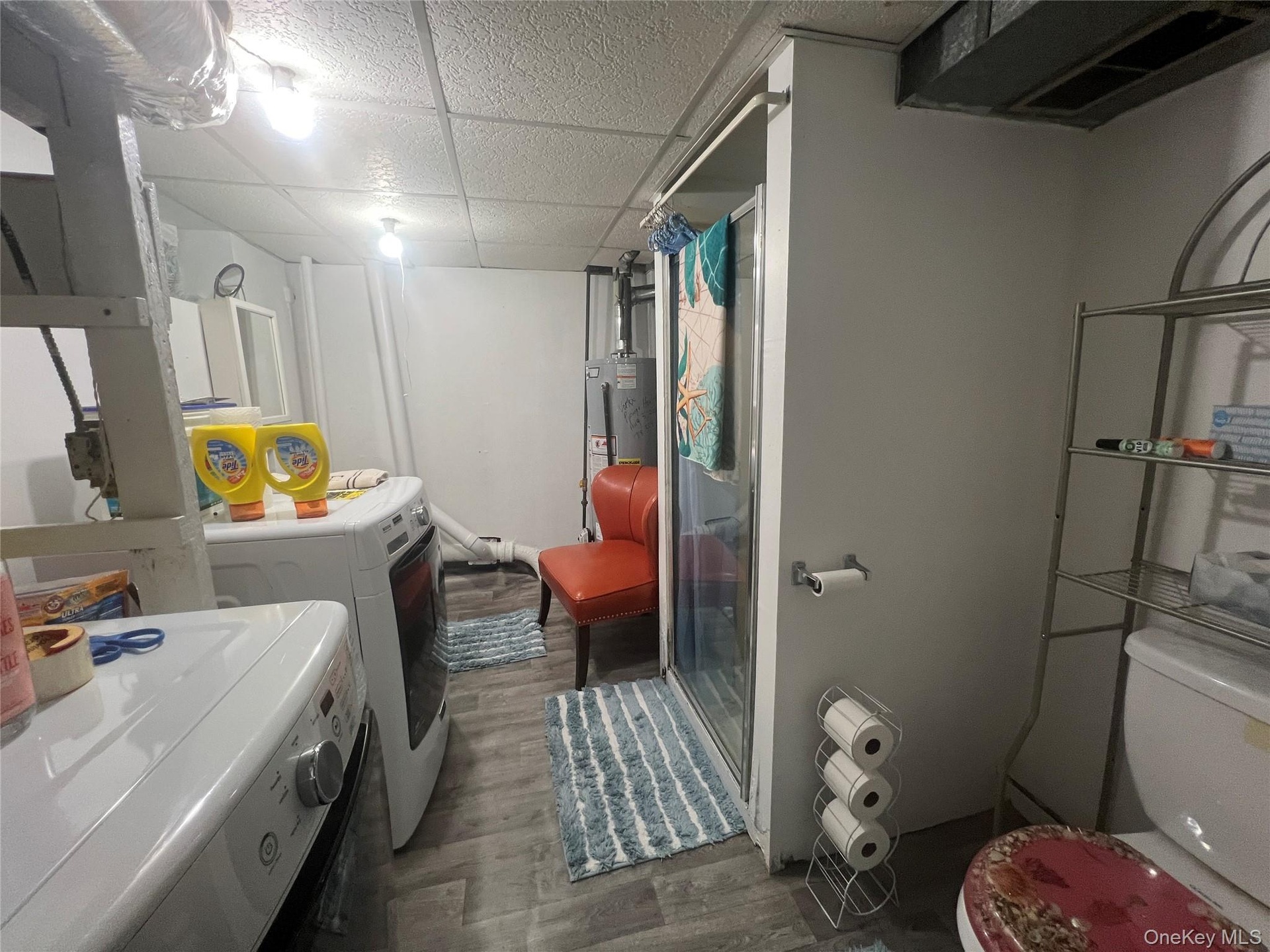 - Bathroom featuring a stall shower, dark wood-style floors, a paneled ceiling, separate washer and dryer, and gas water heater
