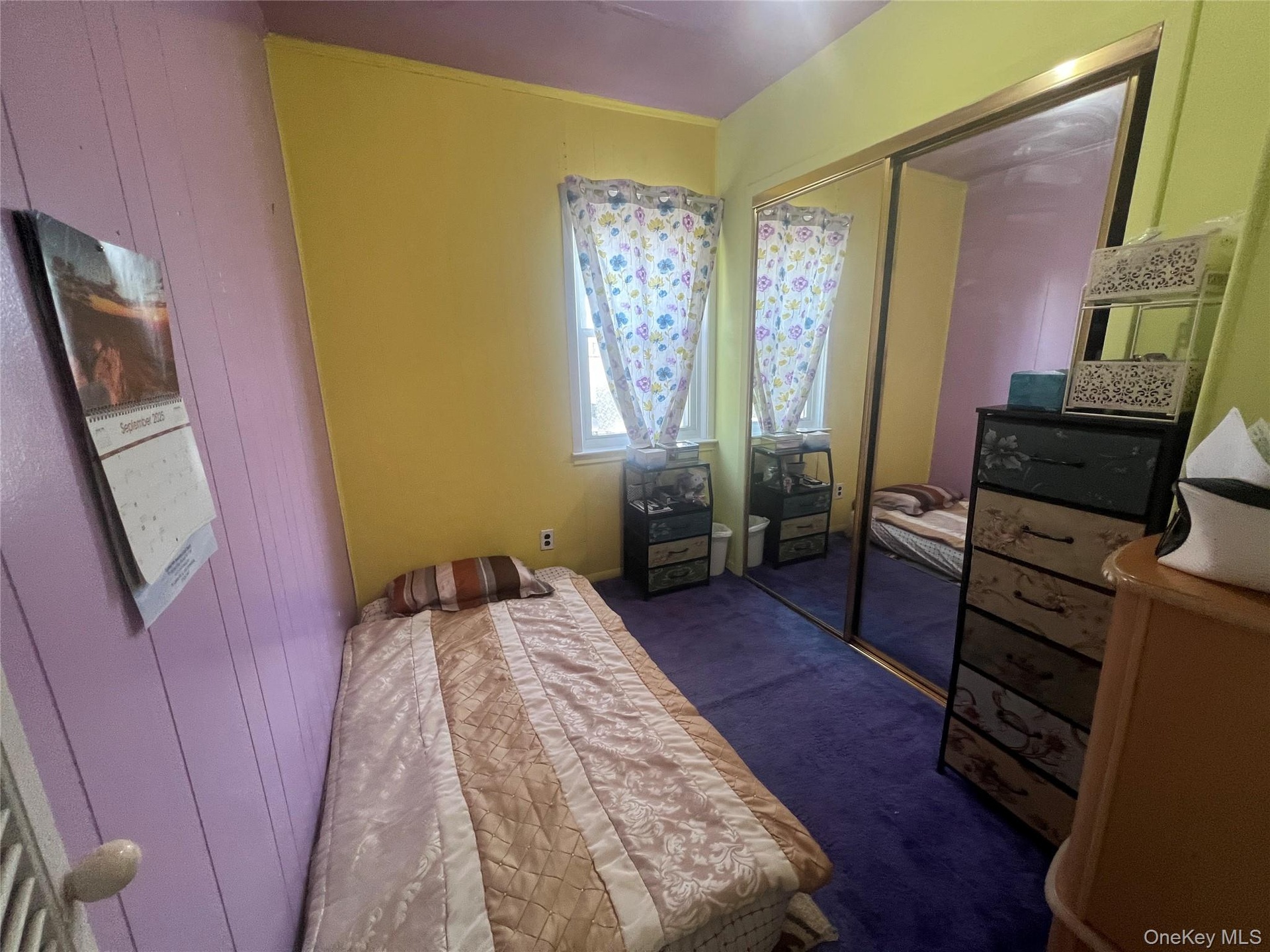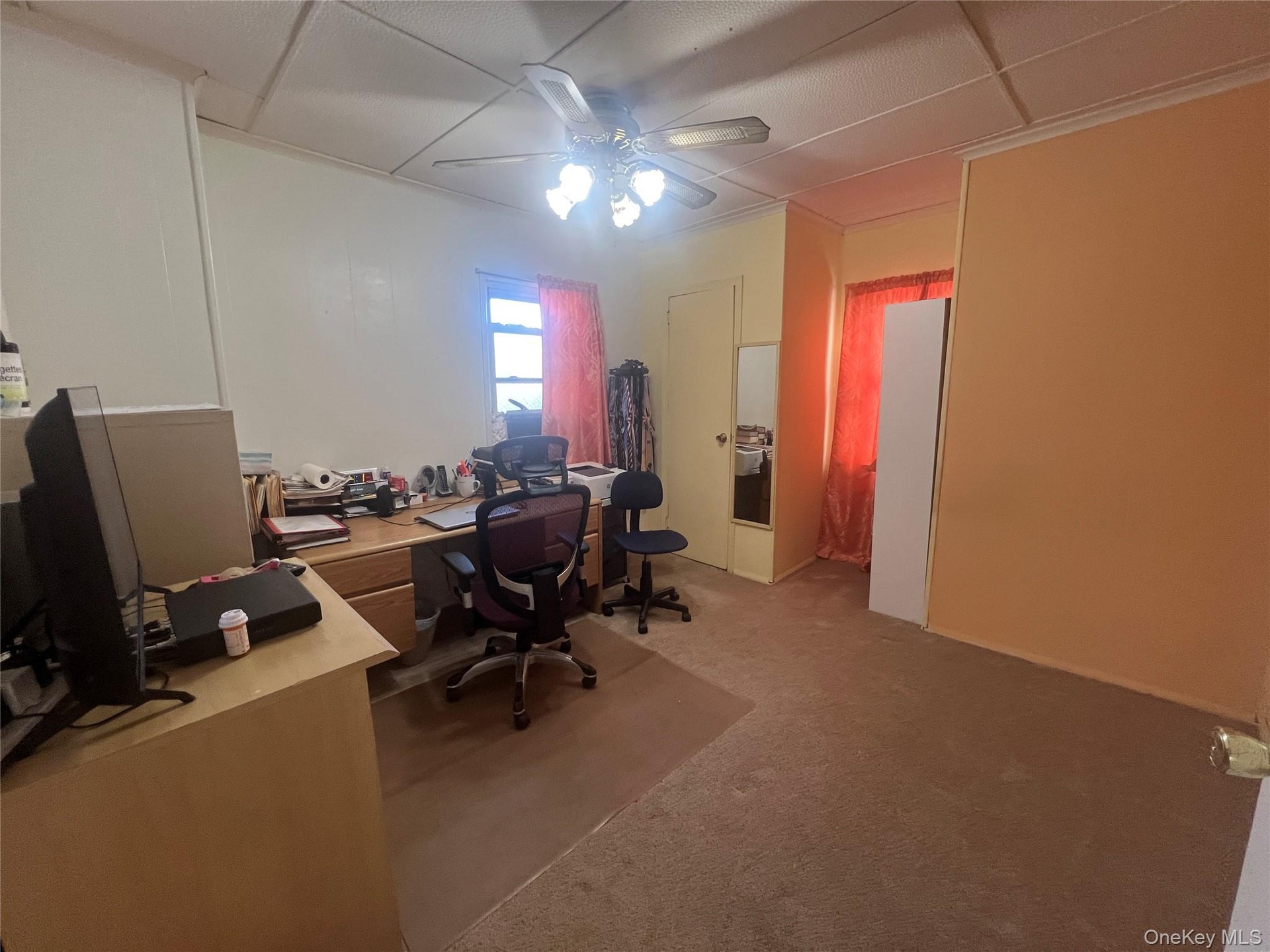 - Bedroom featuring a ceiling fan and dark colored carpet