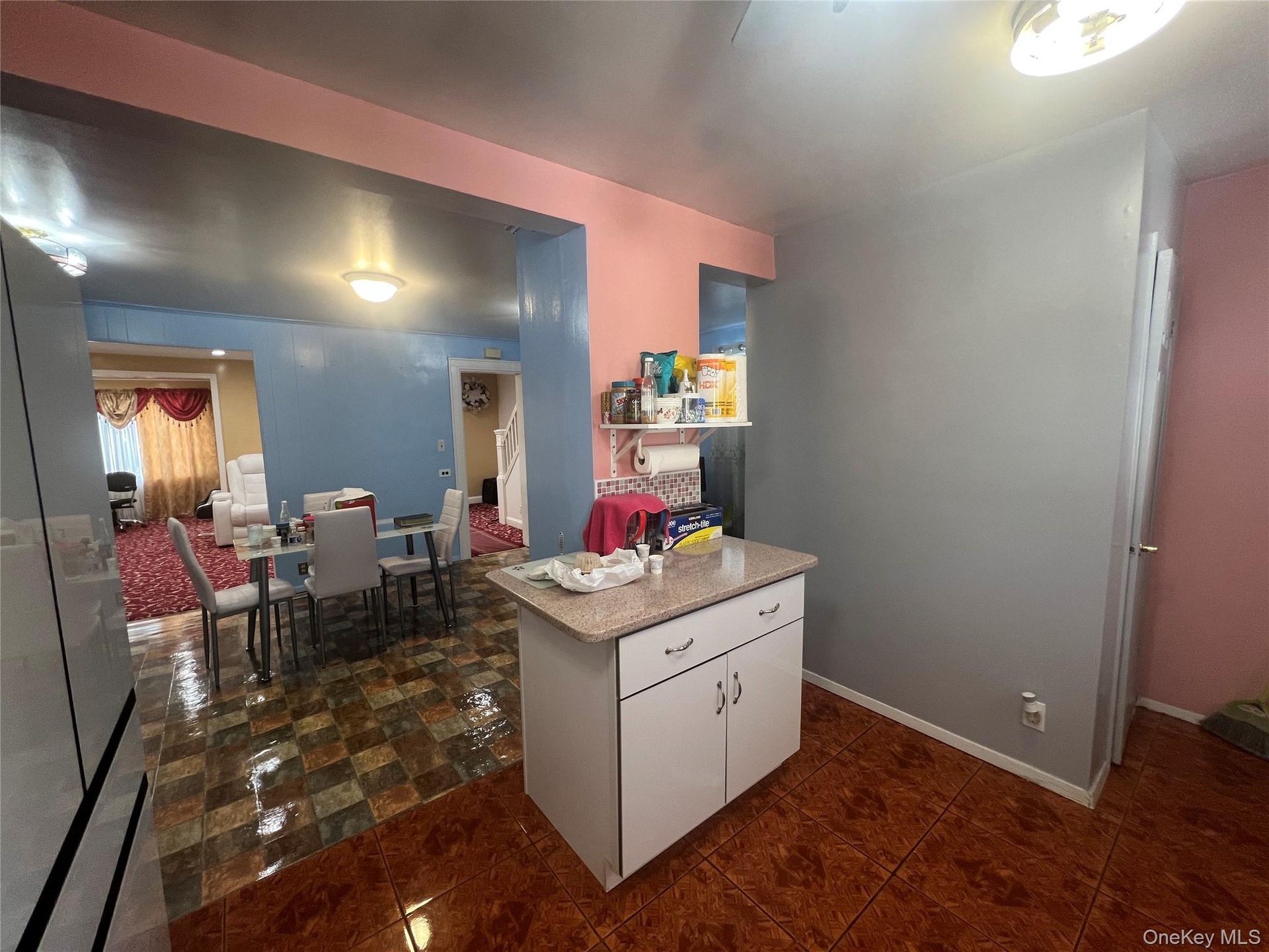 - Kitchen with white cabinetry, freestanding refrigerator, and a kitchen island