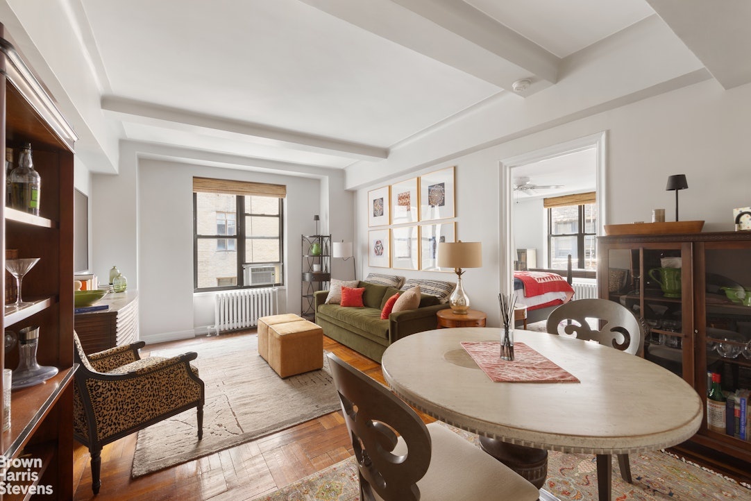 Enjoy quiet sophistication in this beautifully maintained one-bedroom, one-bathroom residence just half a block from Central Park. This prewar gem features classic architectural details, including 9-foot beamed ceilings, hardwood floors, and elegant baseboard moldings.