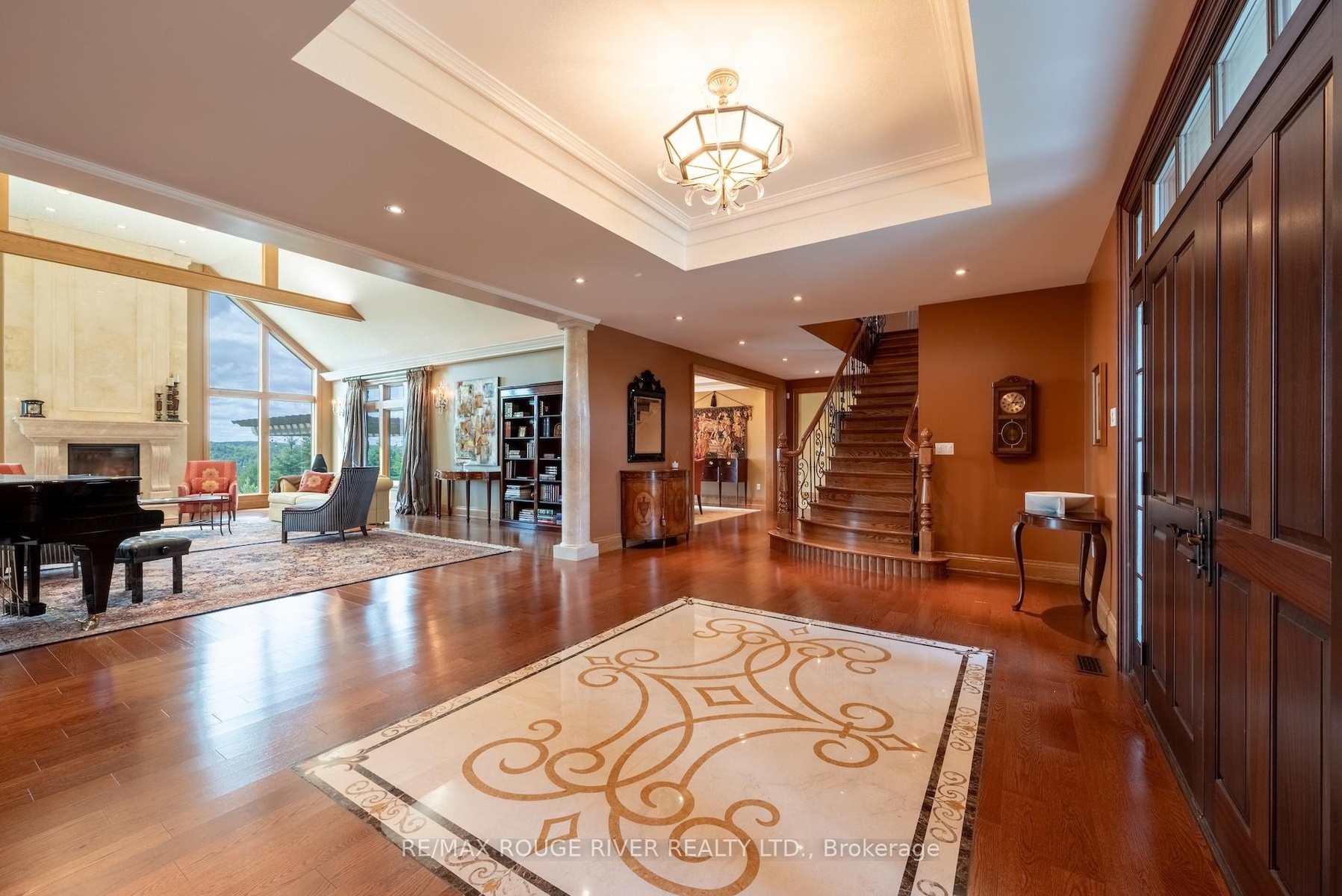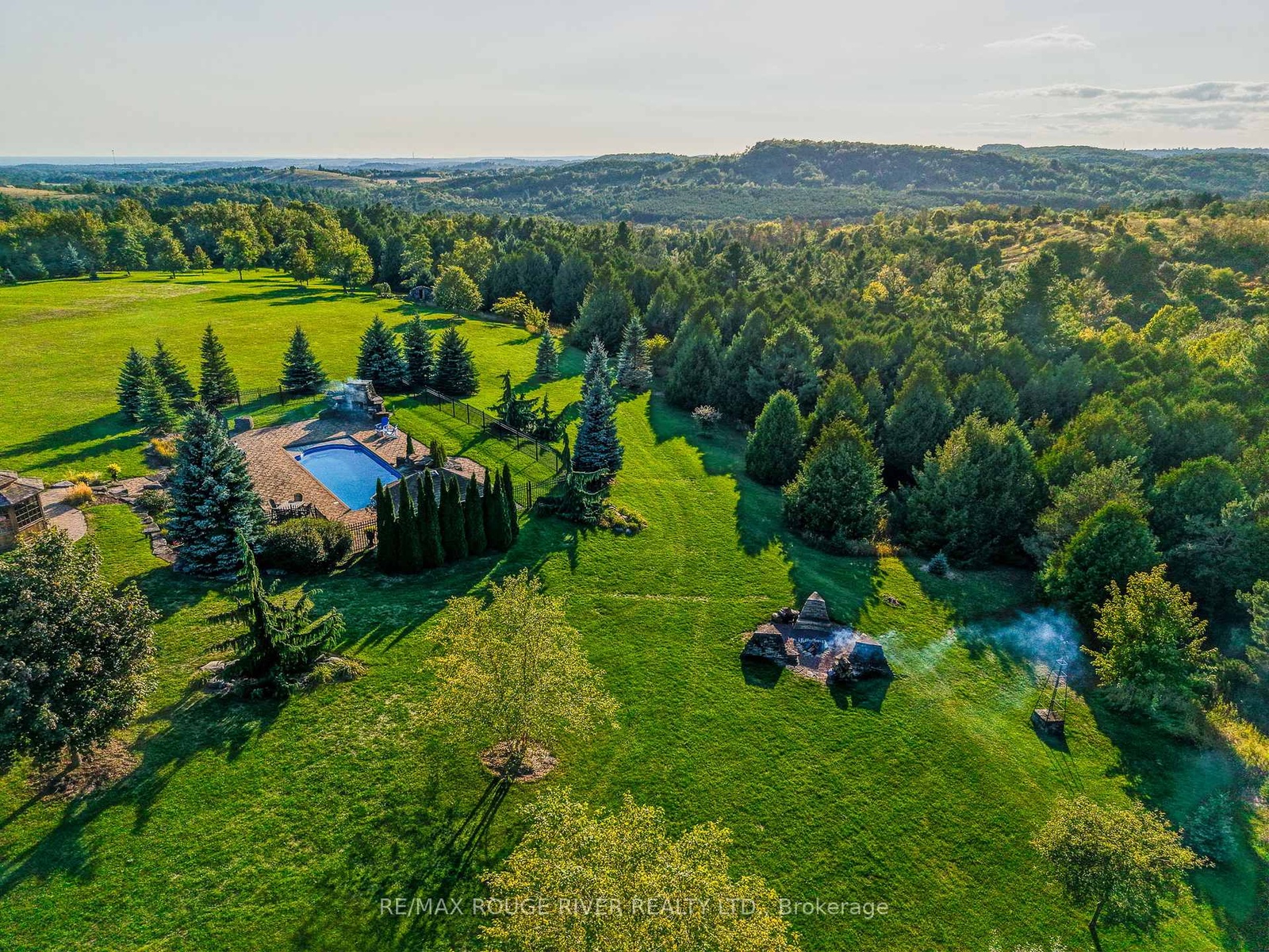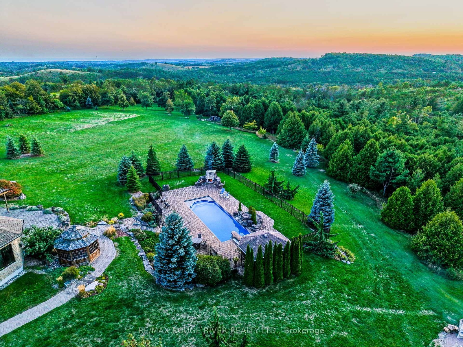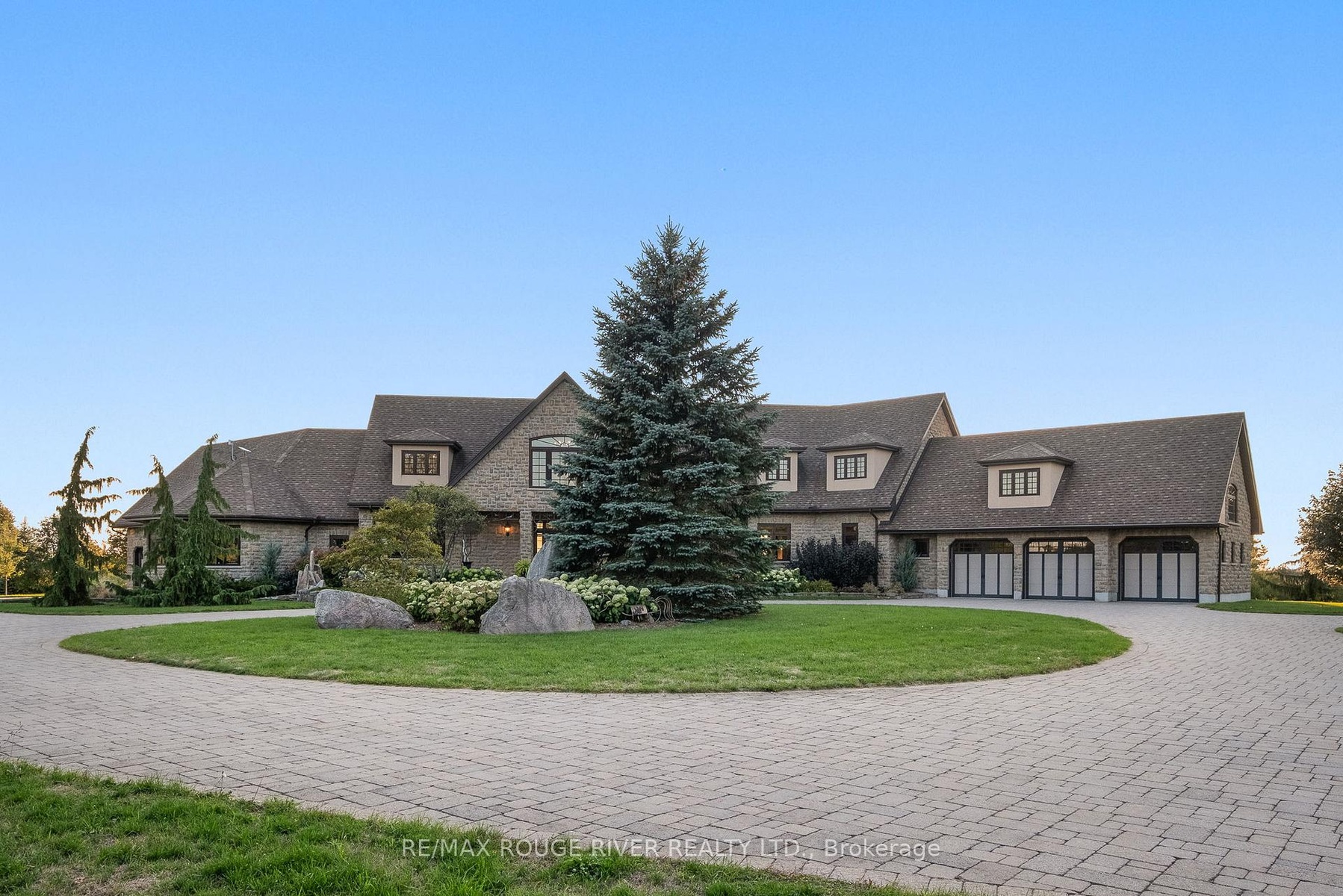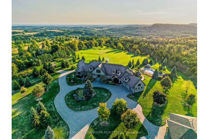 The Finest Country Estate in Northumberland County. Commanding 24 acres of rolling countryside with sweeping 360-degree views, this estate offers a rare combination of architectural mastery and natural beauty, just minutes north of Cobourg. Built with uncompromising craftsmanship, the 11,000 sq. ft. residence (7,500 sq. ft. above grade) blends timeless elegance with modern refinement. From the moment you arrive, the landscape sets the stage with meticulously groomed lawns, orchards, and stone installations by celebrated artisan John Shaw-Rimmington that create a sculpted canvas for outdoor living. At its heart, a resort-style pool framed by expansive stone terraces invites both grand entertaining and quiet retreat, while a private trail system winds through forested grounds to a hilltop lookout with panoramic views of Lake Ontario. Indoors, the residence impresses with a soaring great room 16-foot ceilings, marble columns, and a dramatic fireplace balanced by intimate spaces for everyday living. A Downsview-designed chefs kitchen, butlers pantry, and family room elevate both function and comfort. Seven bedrooms and six baths include a private 2-bedroom suite with it's own garage, while the primary retreat offers a dressing room, spa-inspired ensuite with heated floors, and sauna. Geothermal heating/cooling, an attached 3 car heated garage, a detached 2 car garage/shop and curated designer finishes complete this one-of-a-kind sanctuary. A true estate where architecture, landscape, and lifestyle converge at the highest level.