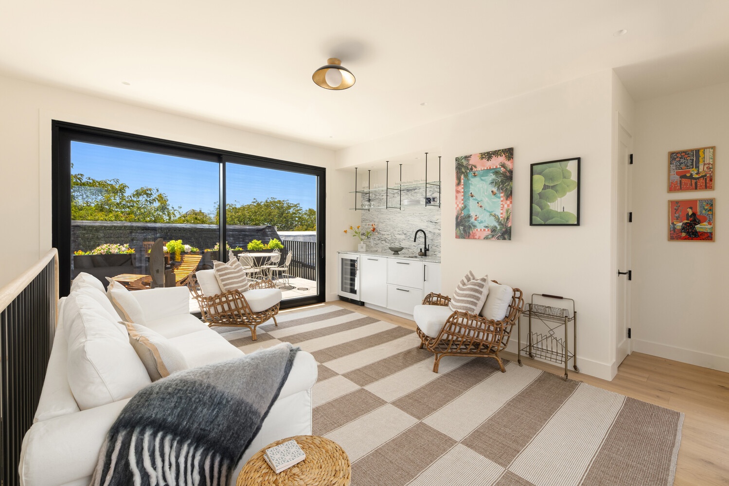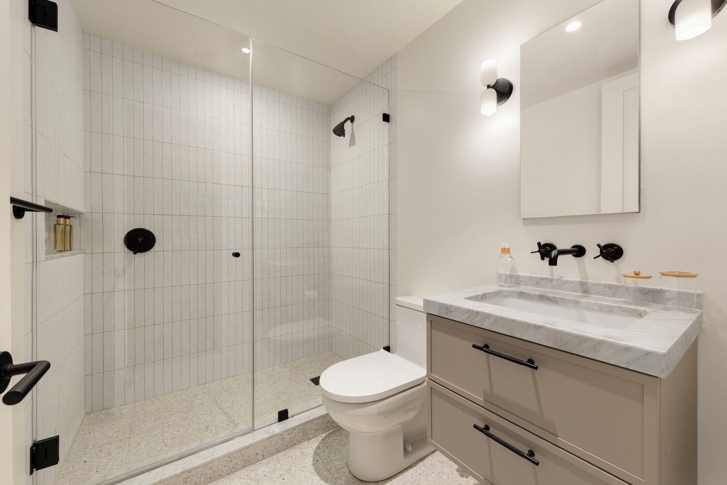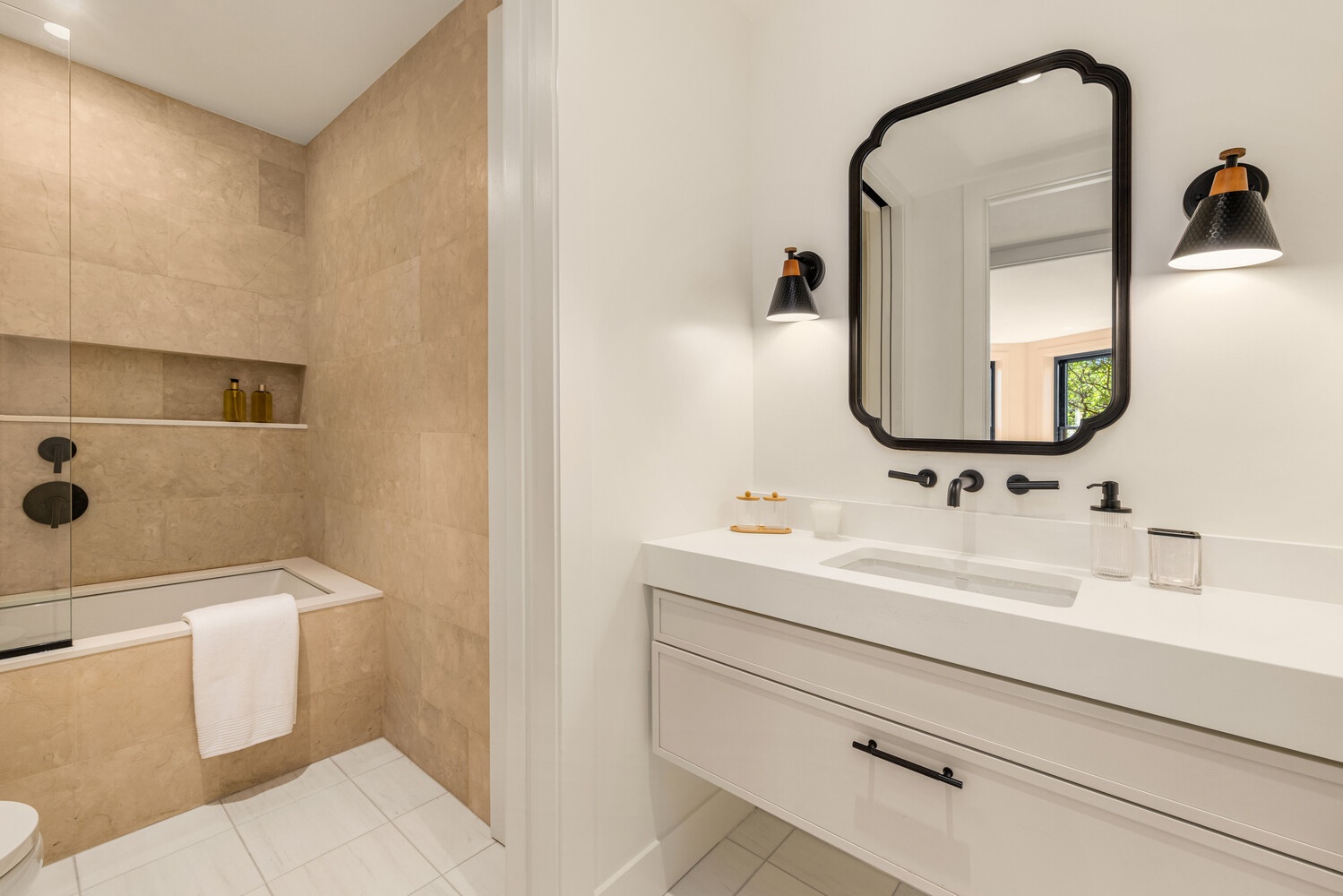 Descending to the garden floor, you are greeted by a generous foyer that opens into a richly appointed living space with direct access to the meticulously designed rear yard. The wet bar is outfitted in Noir Blanc marble. This level also features a spacious bedroom, a full bath with walk-in shower tiled in Bianco Carrara honed marble. The cellar level offers a home gym, wine cellar, and additional storage. An option for an additional laundry room with utility sink is also on this level.