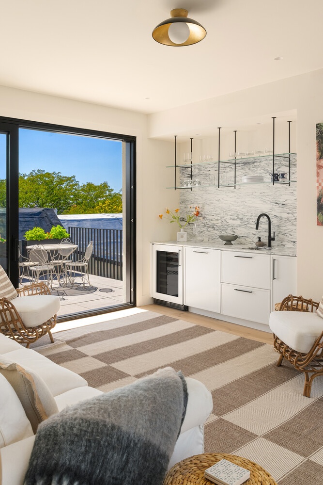 The solarium level offers an elevated living and entertaining experience, surrounded by sweeping views of the Manhattan and Brooklyn skyline. Bathed in natural light, this versatile space is equipped with a honed Arebescato Caldor wet bar, wine fridge, dishwasher, and captivating powder room. Two expansive private terraces extend the living space outdoors. Appreciate the skyline as your backdrop, this level delivers the ultimate retreat, where every moment is touched by sunlight.