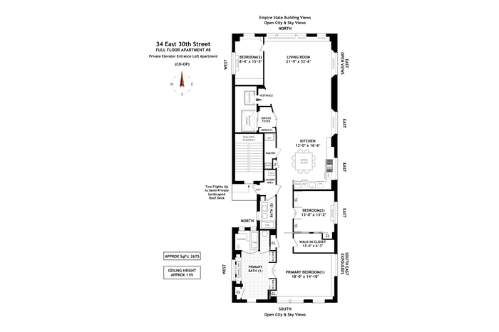 3 Bedrooms, 2 Bathrooms - Full-floor loft residence Expansive Layout - Approx. 83' north to south and 32' east to west (per offering plan) Private Entry - Direct access via keyed passenger and freight elevators Soaring Scale - Approx. 11' ceilings and oversized casement windows facing North, South, East, and West provide an abundance of natural light Corner Living Room - With north and east exposures, Empire State Building views, beamed ceilings, and custom built-in cabinetry Open Chef's Kitchen - Windowed, with exceptional counter and storage space plus a 16-seat center dining island Premier Appliances - Two Wolf 6-burner ranges and hood, under-cabinet Sub-Zero refrigerator, Sub-Zero 48b wine fridge, and Miele dishwasher Additional Pantry Room - Featuring Liebherr refrigerator and Sub-Zero wine fridge Primary Suite Retreat - King-sized corner bedroom (south and east exposures) with two closets, including WIC, and windowed en suite bath Primary En Suite - Windowed, custom built-ins, marble double vanity, and spa-like wet room with glass-enclosed shower and soaking tub Secondary Bedrooms - Large second bedroom with east exposure and three closets; third corner bedroom with north and west exposures Additional Bath - Windowed, with marble vanity and soaking tub Laundry Room - Outfitted with Miele washer/dryer Modern Comforts - Central air, hardwood floors, mounted projector and screen system, built-in speaker system