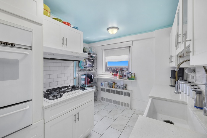 The spacious primary suite enjoys southern exposures and a large, deep closet, creating a true retreat. The second bedroom, set on the corner with both south and east exposures, is a cozy, light-filled sanctuary. The renovated windowed bathroom preserves its mid-century heritage with the original cast-iron bathtub/shower and original dual medicine cabinets with built-in hamper, blending vintage charm with modern updates.
