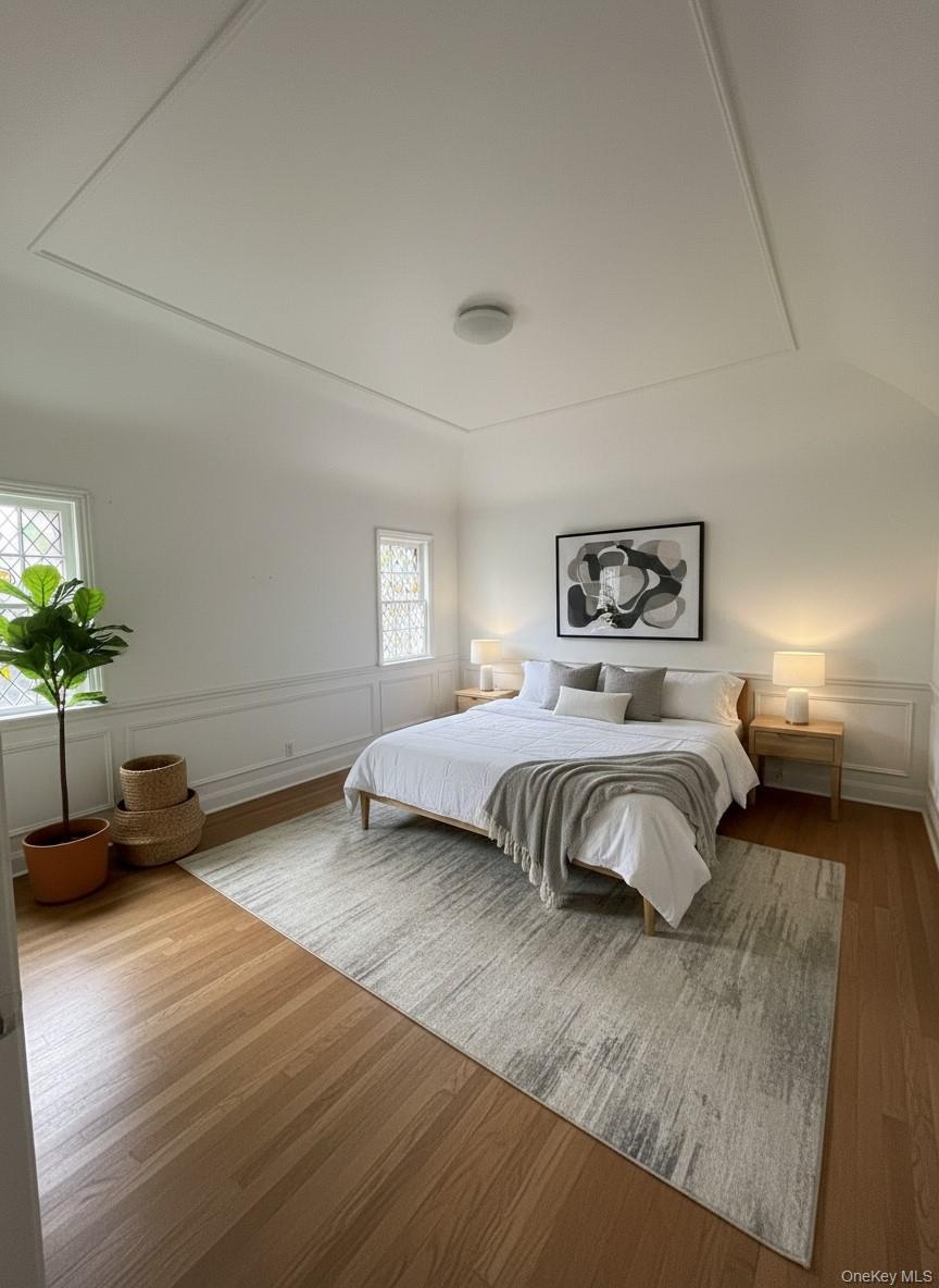 - Spare room with wallpapered walls, wainscoting, radiator, hardwood / wood-style flooring, and a decorative wall