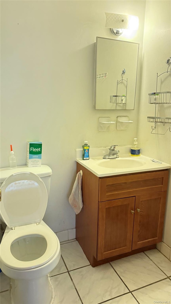 - Bathroom with vanity and light tile patterned floors
