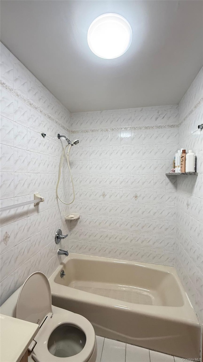 - Bathroom with bathing tub / shower combination, tile patterned floors, and tile walls