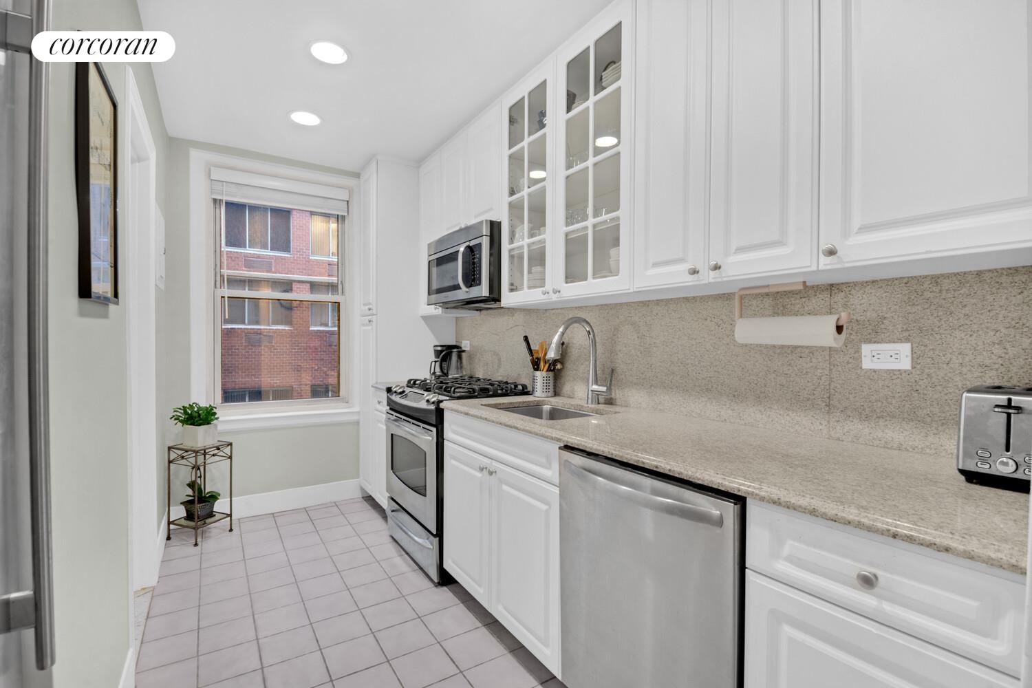 Entering 2E you will note a fastidiously maintained home with beamed ceilings over hardwood floors, decorative moldings, and designer lighting. At around 850 SF, the unit has a 20 ft long living room, separate dining area, separate kitchen, jack and jill bathroom and a graciously proportioned bedroom. The windowed kitchen has granite countertops, stainless steel appliances including a subzero refrigerator, gas range, dishwasher, and built-in microwave. The windowed bathroom has a tub, marble accents, and classic fixtures. There are two closets in the foyer, one lined with cedar, and two in the bedroom. The apartment was recently painted and skim coated, and the electrical service was upgraded.