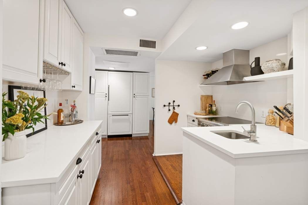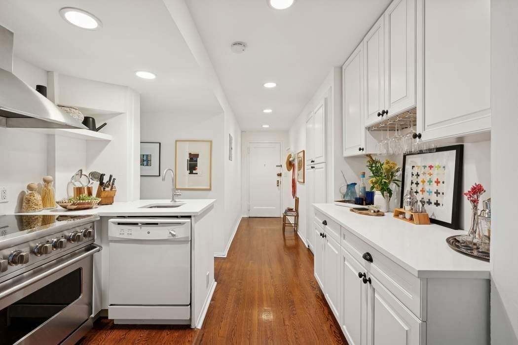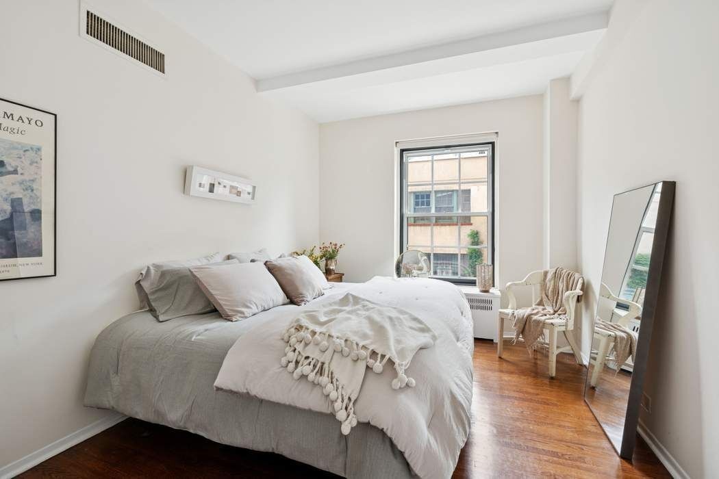 Residence 2J is distinguished by beautiful hardwood floors, large windows, and a split-bedroom layout that creates a private sanctuary. An expansive great room accommodates both living and dining with ease and captures picturesque southern views over the storybook charm of Washington Mews. The primary bedroom faces a quiet courtyard, creating a restful retreat, and includes an ensuite bath finished with classic subway tiling. The second bedroom, also overlooking the Mews, is generously proportioned to accommodate a king-size bed. A renovated second bathroom with a glass-enclosed shower is conveniently situated off the hall. The kitchen is efficient yet elegant, appointed with Viking and Miele appliances, an integrated refrigerator, streamlined cabinetry, and white quartz countertops. Central air conditioning provides the home with year-round comfort.