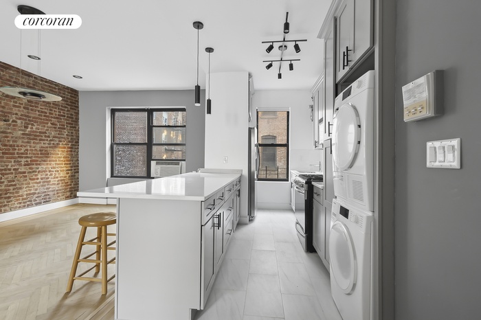 BACK ON THE MARKET WITH A BRAND NEW KITCHEN, RENOVATED DECEMBER 2024, WITH WASHER AND DRYER!! Overlooking tree-filled Lafayette Plaza and the Hudson River, this pre-war north and south facing two-bedroom co-op apartment has lots of light. The open plan, renovated windowed kitchen has a breakfast bar, dishwasher, gas range Miele full-size washer and dryer, dishwasher, gas range and plenty of cabinet space. Flowing directly into the large great room you will find a spacious living, and dining room with exposed brick walls, refinished herringbone hardwood floors, nine-foot ceilings, recessed lighting, and a long foyer to hang your favorite art pieces. Two nice size bedrooms, four big closets and room to grow. Located on the corner of 181 Street and Riverside Drive, overlooking the Hudson River. Just minutes away are the A and 1 train stations, M4, M5, M98, Bx7 and M100 buses, and the George Washington Bridge Terminal with bus service to New Jersey. Easy commute to New York Presbyterian Hospital, City College and Columbia University. The welcoming neighborhood has all the local services you need, including fitness centers, grocers, hardware stores, restaurants, Cabrini Wine Shop, Citi Bike, and more. Enjoy outdoor time in nearby Fort Tryon Park, and visit the Cloisters and Heather Garden, or head down to the Hudson River to Fort Washington Park where you will find the Little Red Light House, tennis courts, soccer, and baseball fields, running trails, and a bike path that is traffic-free all the way down the west side of Manhattan to Battery Park. Come make this Manhattan neighborhood your new home. There is an assessment in place of $350 /month to the end December 2025.