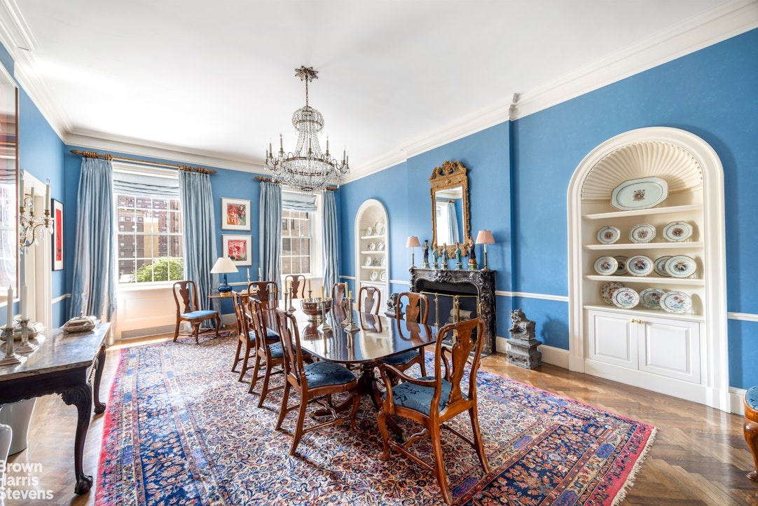 Designed by renowned architect Rosario Candela, the residence offers grand scale rooms with a gracious layout accentuated by magnificent architectural elements. A sweeping 23-foot gallery opens onto a sprawling 31 x 20 ft. living room with a woodburning fireplace and three large windows overlooking Park Avenue. The home's soaring 11 ft. ceilings are enhanced by beautiful traditional moldings throughout, and restored herringbone flooring may be found in all of the public rooms. Adjacent to the living room, there is a handsome paneled library with a wood-burning fireplace that also faces the Avenue. A powder room may also be found off the gallery. At the opposite end of the gallery is an elegant 25-foot formal dining room with a fireplace, a separate dry bar and a closet for china and stemware storage. The dining room has open views to the east. A modern and impressive Chef's eat-in-kitchen with four large windows overlooking townhouse gardens may be found along the Eastern wing of the home. The enormous 28 x 13 ft. kitchen has top-of- the line appliances, ample counter space, and custom cabinetry. The bright and open views over townhouses and gardens to the east make it one of the best eat-in-kitchens on Park Avenue.