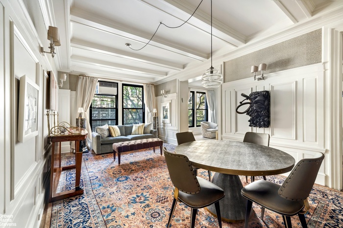 A gracious, turn-of-the-century corner residence offering three spacious bedrooms and a dedicated home office, all within a full-service building in a prime Upper West Side location. Grand in scale and refined in flow, this sun-filled home boasts soaring 10-foot beamed ceilings and nearly 7-foot-tall windows that frame peaceful, tree-lined views.