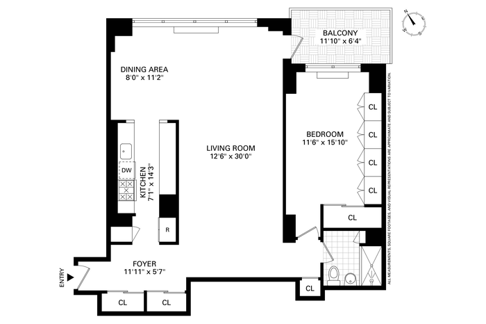 As the largest of the one bedroom apartments in all of Lincoln Towers this nearly 1,000 square foot home has been updated and customized with an expanded kitchen and bathroom . . . PLUS, you get your own private balcony. The grand 12 foot foyer has 2 large closets, leading to the enormous 30 foot long living room which accommodates every conceivable furniture layout - including room for a convenient home office or 2nd bedroom. The wall of four north-facing windows flood the apartment in generous light with sky and building-top views from both the living, dining, and bedroom. The dining alcove is currently used as a casual living space; however, the living room still accommodates a table for six. This is the perfect home for dinner parties, casual entertaining or just relaxing at home. The dining area is easily converted to a 2nd Bedroom or private Home Office. The dual access kitchen has been expanded 3 feet and updated with tall maple cabinets and granite countertops, and can be opened to the living area with a convenient breakfast bar. The fully renovated and expanded bathroom has modern black & white Escher porcelain tile and a glass enclosed walk-in shower. The large bedroom can easily accommodate a king-sized bed, dressers, night stands and offers a quiet escape overlooking a lovely garden view. The nearly 12 foot balcony is an extension of your living space and offers an added bonus not often available in the 1BR market.